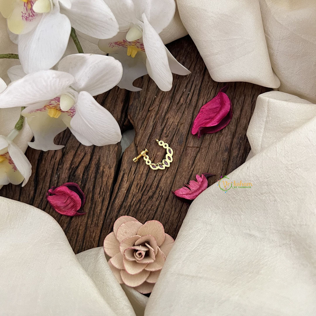 The Vriksham Leaf Style Naths features a refined red design inspired by the natural elegance of leaves. This delicately crafted nose pin combines traditional motifs with a modern aesthetic, offering a sophisticated accessory that adds a graceful and distinctive touch to any ensemble.