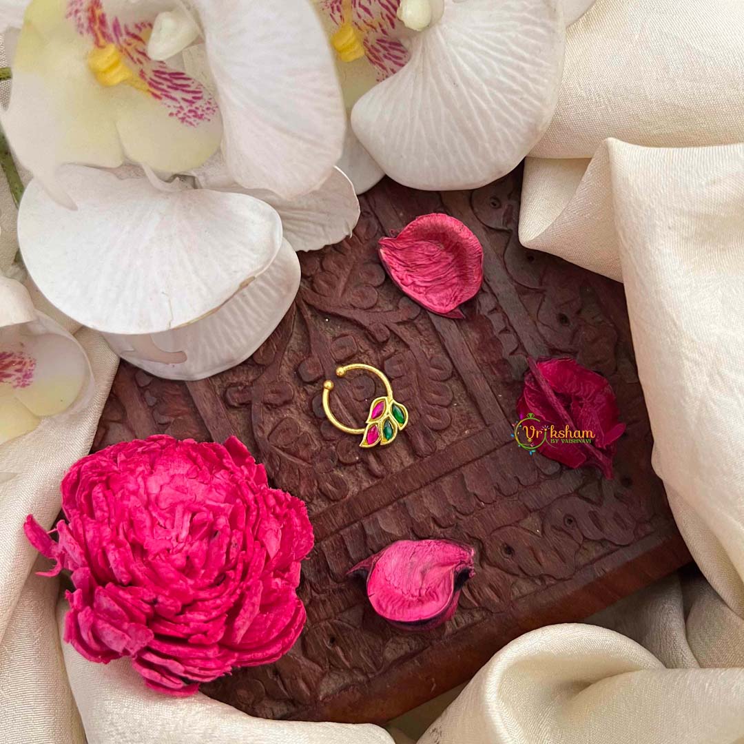 Indulge in understated sophistication with this leaf-style kundan jadau septum ring, where verdant and crimson hues converge in exquisite artistry. The graceful leaf silhouette frames luminous green and red kundan stones, each meticulously set using the revered jadau technique that defines Indian jewelry excellence. This refined piece celebrates the intersection of nature's organic beauty and masterful craftsmanship, creating a harmonious visual composition. The jewel tones radiate with subtle brilliance, elevating your septum piercing into a distinguished accessory. Perfect for those who appreciate minimalist elegance paired with cultural authenticity, this ring serves as a timeless expression of refined taste and appreciation for traditional artisanal heritage.