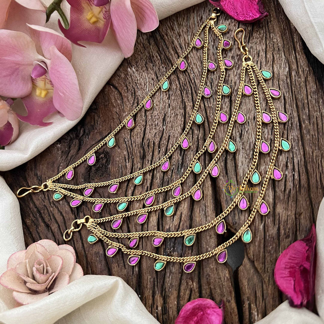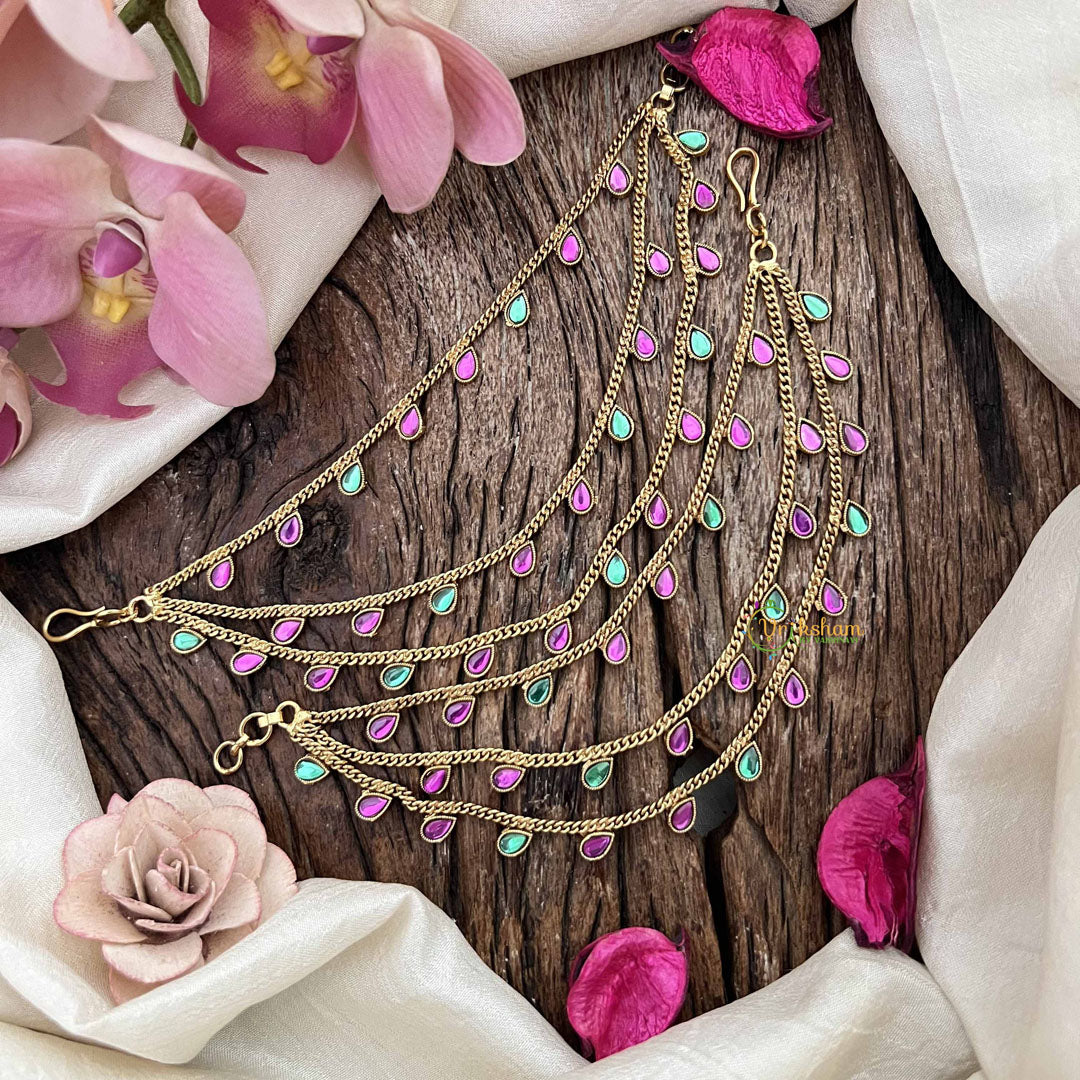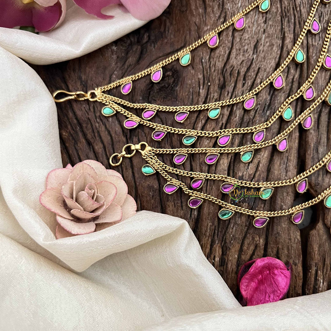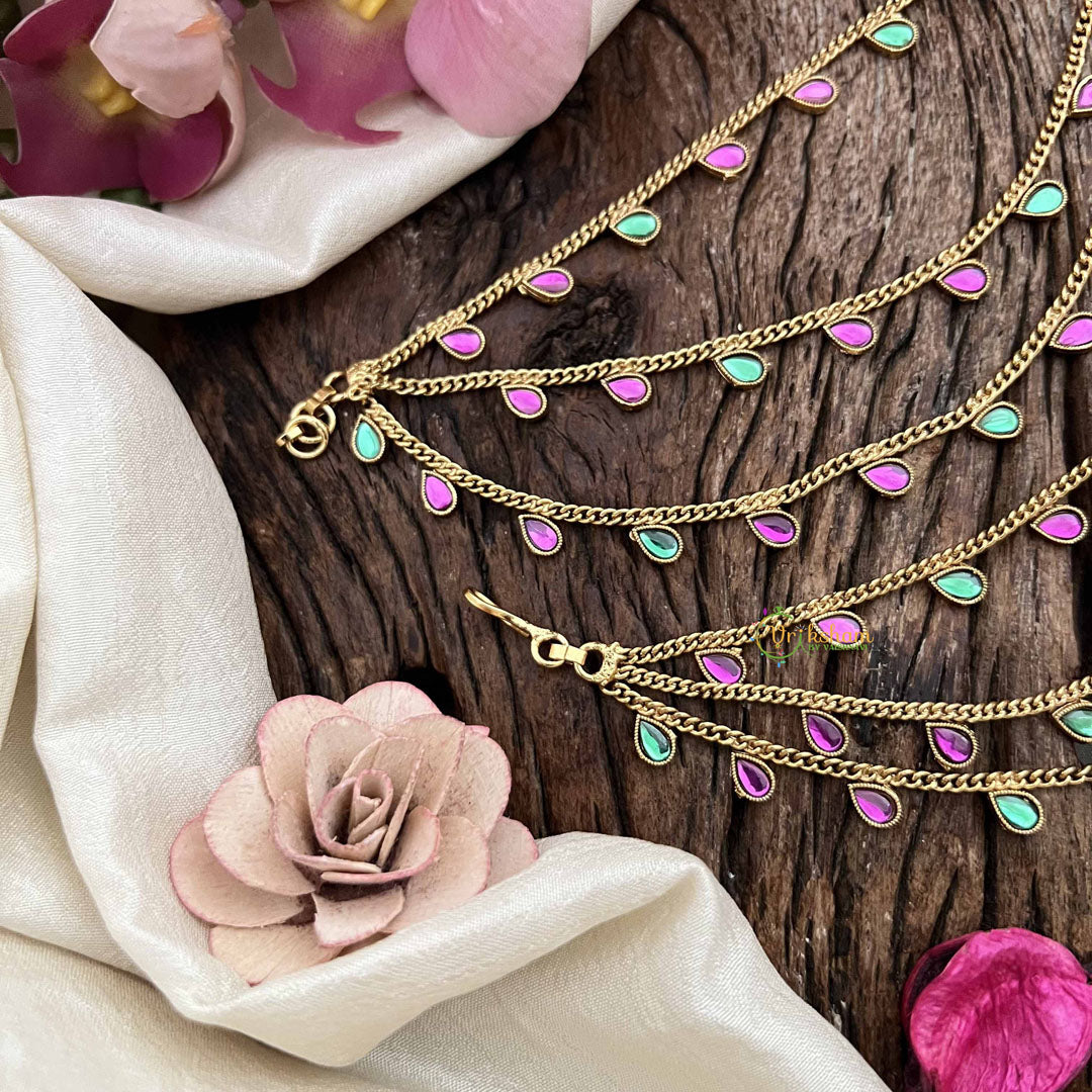 Embrace timeless elegance with this exquisite three-layered maatil strand, where leaf-inspired design meets vibrant gemstone artistry. Featuring rich red and verdant green stones meticulously arranged across delicate strands, this piece captures the essence of natural beauty and refined craftsmanship. Perfect for elevating traditional attire or adding a touch of cultural sophistication to contemporary styling, this maatil seamlessly blends heritage aesthetics with modern sensibility. A statement accessory that celebrates intricate design and authentic gemstone work.