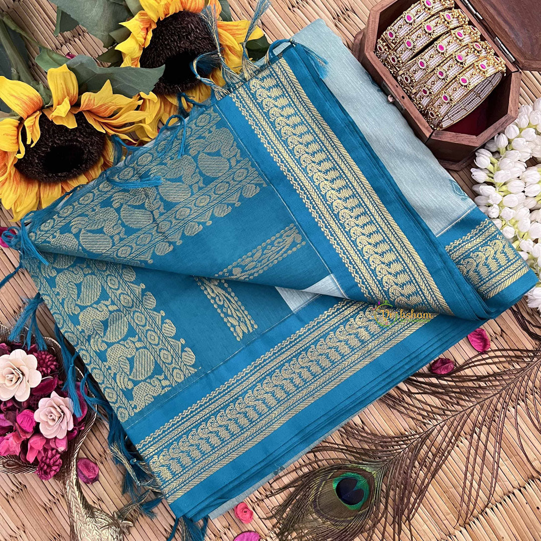Embrace timeless elegance with this exquisite Kalyani cotton saree, featuring a serene light sky base adorned with intricate butta motifs. The rich bottle green border adds a striking contrast, creating a sophisticated silhouette perfect for both traditional celebrations and contemporary occasions. Crafted from premium Kalyani cotton, this saree offers exceptional comfort and breathability, ensuring you remain poised throughout the day. The refined color palette and detailed craftsmanship make it an ideal choice for those who appreciate understated luxury and authentic textile artistry.