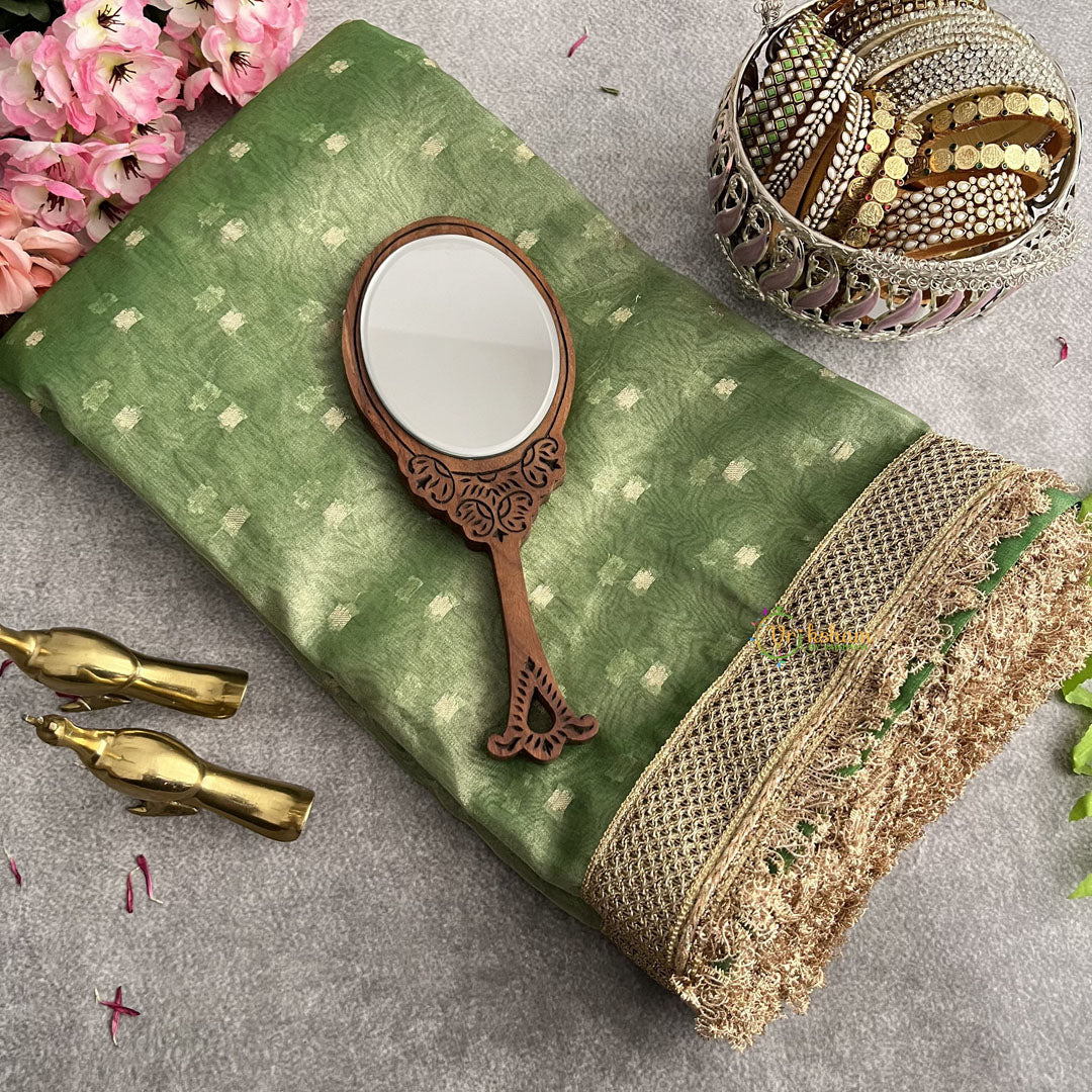 Indulge in the exquisite elegance of our Vriksham Green With Lace Organza Saree. Handloomed with care, this saree features a delicate green color and intricate lace detailing. Elevate your look with this luxurious and exclusive saree, perfect for any special occasion. Experience the beauty and sophistication of Vriksham.
