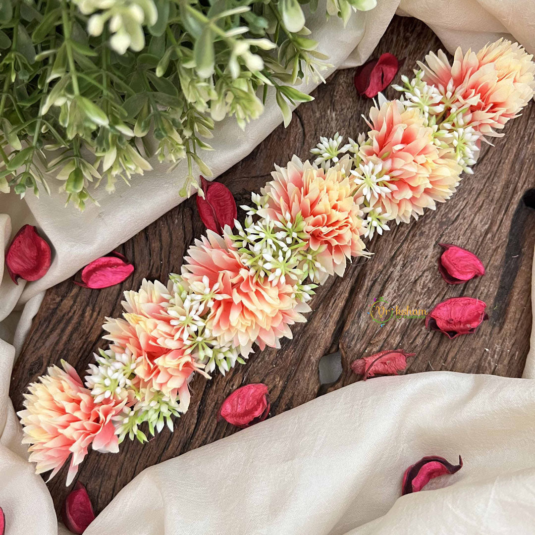 The Vriksham Light Orange & Leaf Style Artificial Gajra features gentle light orange blossoms paired with subtle leaf accents and adorned with elegant pearl coatings. This sophisticated accessory provides a refined and graceful enhancement to traditional attire, ideal for weddings and special celebrations.