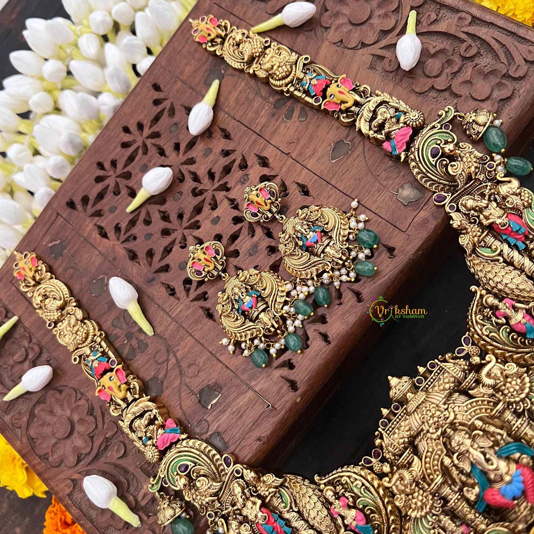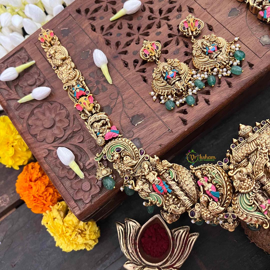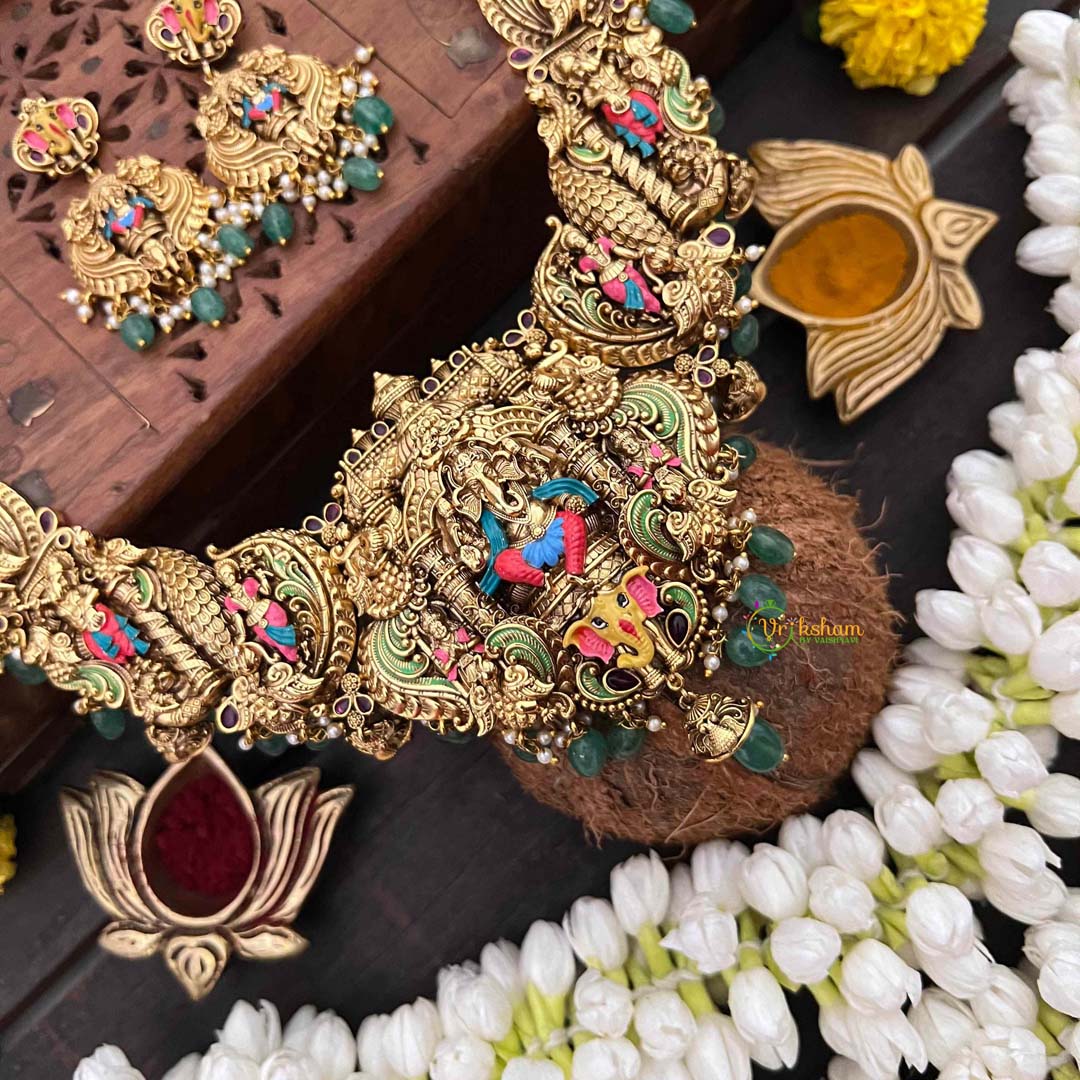 Celebrate divine elegance with this exquisite Lord Ganesha neckpiece, a masterpiece of traditional Indian craftsmanship. Hand-painted enamel work adorns the sacred pendant, complemented by vibrant green bead accents that add depth and movement. This long neckpiece is designed for the discerning bride seeking spiritual significance woven into her bridal ensemble. The intricate detailing and rich color palette make it a versatile statement piece that honors heritage while elevating any occasion. Perfect for weddings, festivals, or moments when you wish to carry blessings close to your heart.