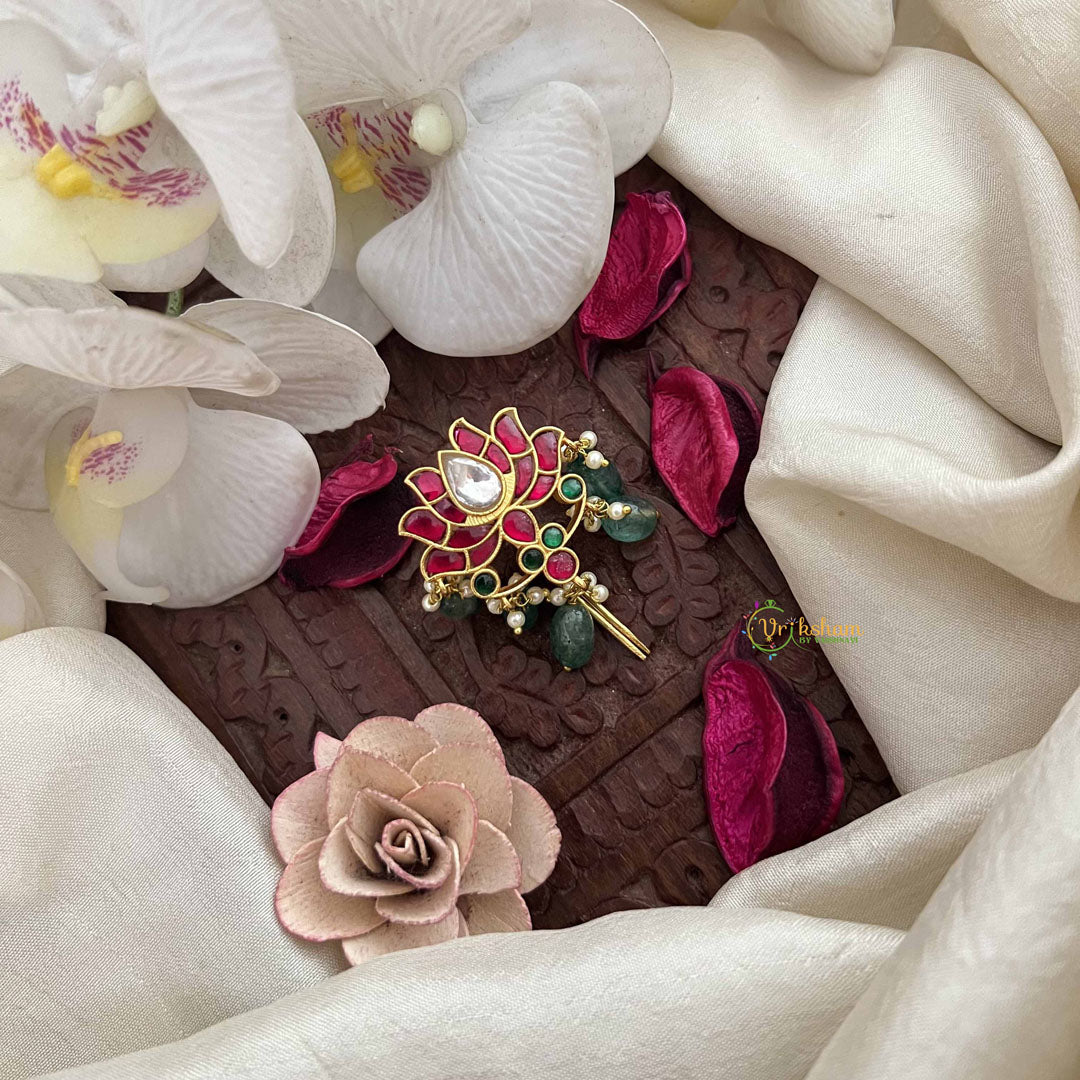 The Vriksham Lotus Bloom Kundan Jadau Jada Billai features a delicate lotus design embellished with red, green, and white stones, complemented by a vibrant green bead. This elegant accessory adds a refined touch to traditional hairstyles, making it an ideal choice for festive and ceremonial occasions. Crafted for timeless beauty and grace.