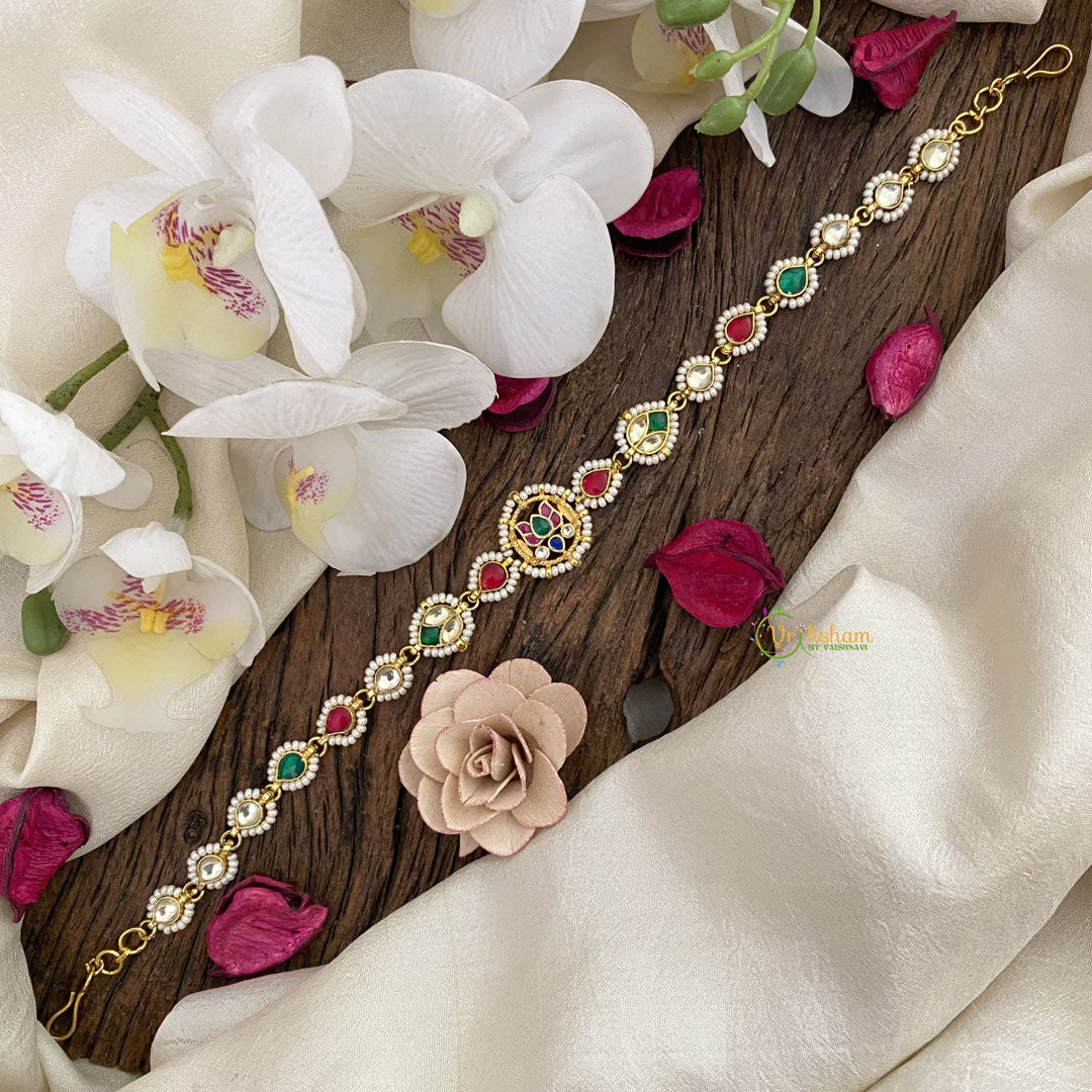 Elevate your look with the exquisite Vriksham Lotus Floral Kundan Jadau Sheeshphool in stunning shades of red, green, and white. Inspired by blooming lotus flowers, this intricate piece adds a touch of sophistication and luxury to any outfit. Handcrafted with premium materials, it is a must-have for any discerning fashion enthusiast.