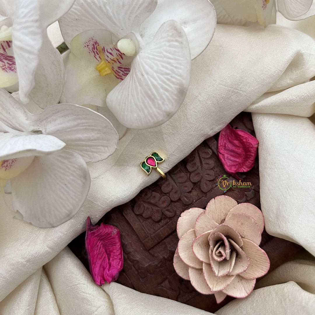The Vriksham Lotus Jadau Kundan Nath in red and green features an elegant lotus motif crafted with intricate Kundan detailing. This sophisticated nose ring combines traditional design with refined artistry, adding a graceful and timeless accent to your ensemble.