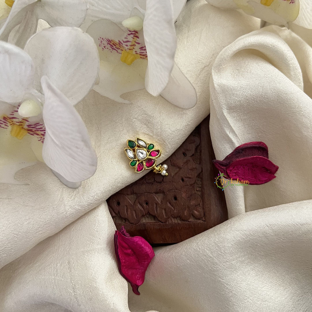Add a touch of elegance and sophistication to your look with the Vriksham Lotus Jadau Kundan Nath. Adorned with red, green, and white pearls, this stunning piece is inspired by the lotus flower and will bring a sense of luxury to any ensemble. Handcrafted with intricate jadau and kundan work, this nath is a true work of art. Elevate your style with Vriksham.