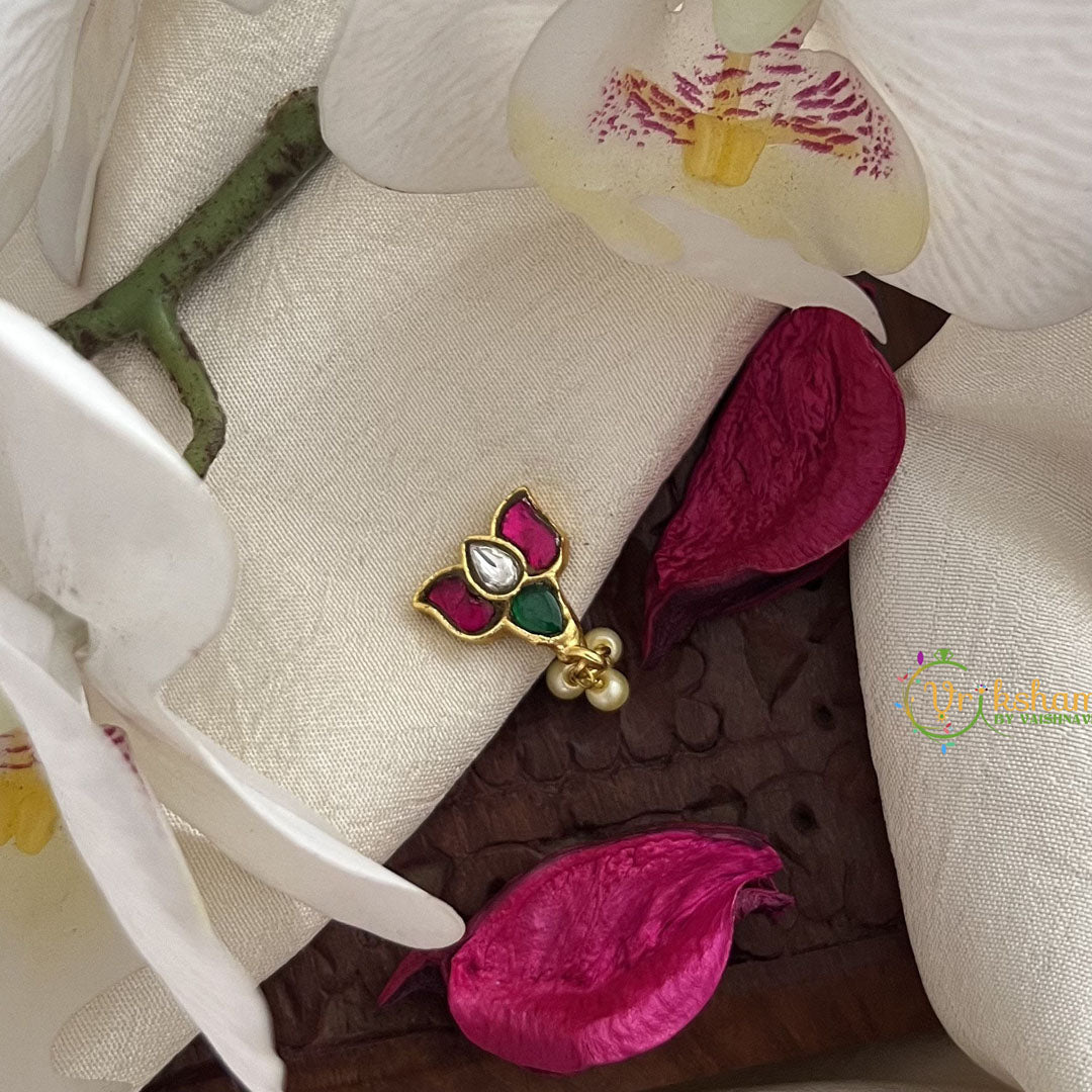 Introducing the Vriksham Lotus Kundan Nath, designed with intricate red, white, and green kundan stones. Adorned with lustrous pearls, this piece exudes elegance and luxury. Perfect for special occasions, this nath will elevate your style and make you stand out. Embrace the beauty of the lotus with this exquisite piece.