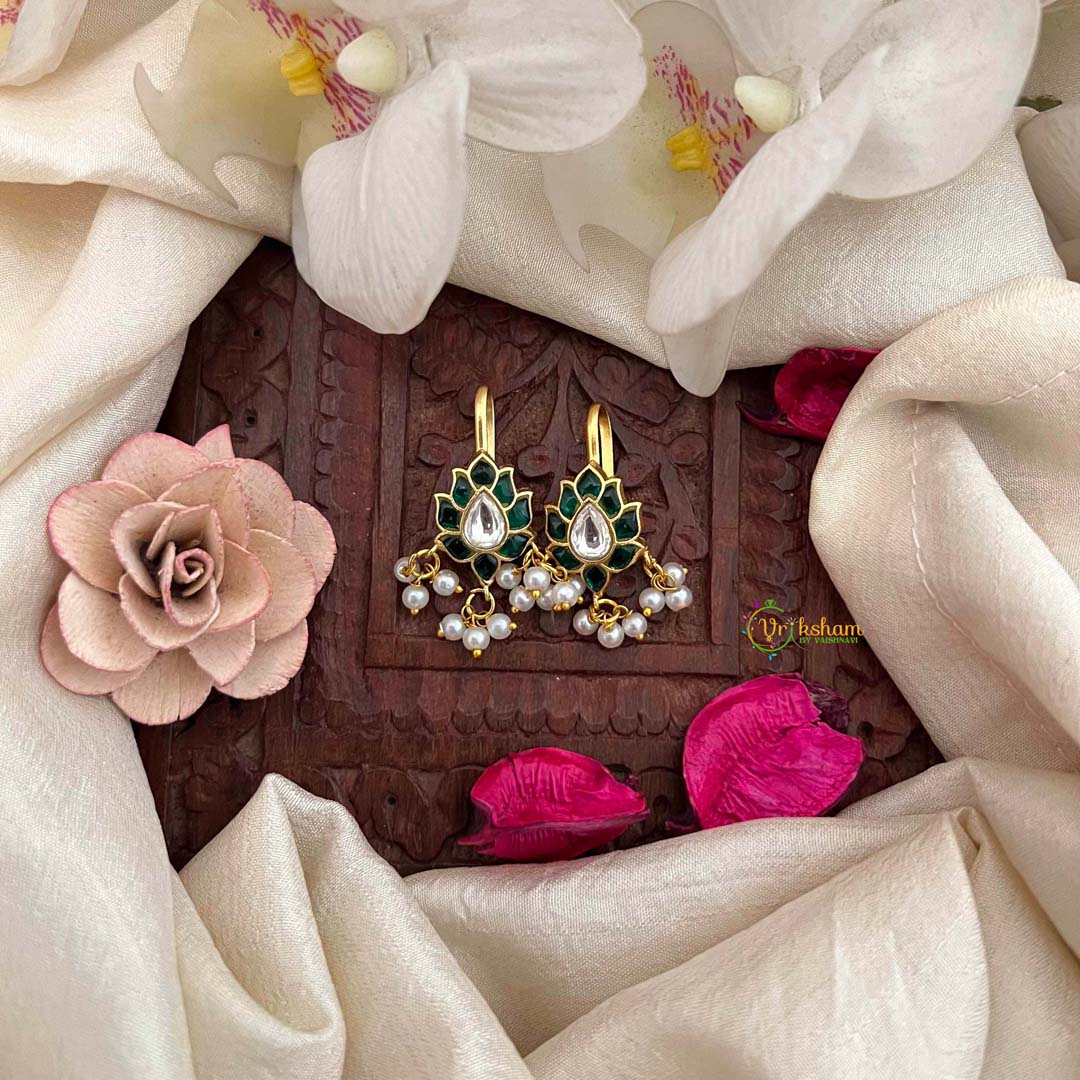Discover refined beauty in this Lotus Leaf Style Kundan Pearls Drop Jadau Bugadi, adorned with verdant green and pristine white gemstones. This sophisticated piece showcases the intricate jadau craftsmanship, where pearls cascade gracefully within an ornamental kundan framework. The symbolic lotus leaf design evokes elegance and spiritual significance, making it an exceptional choice for weddings, celebrations, and formal gatherings. Handcrafted with meticulous attention to detail, this heirloom-quality earring combines traditional artistry with timeless appeal. A distinguished accessory for those who value authentic craftsmanship and understated luxury.