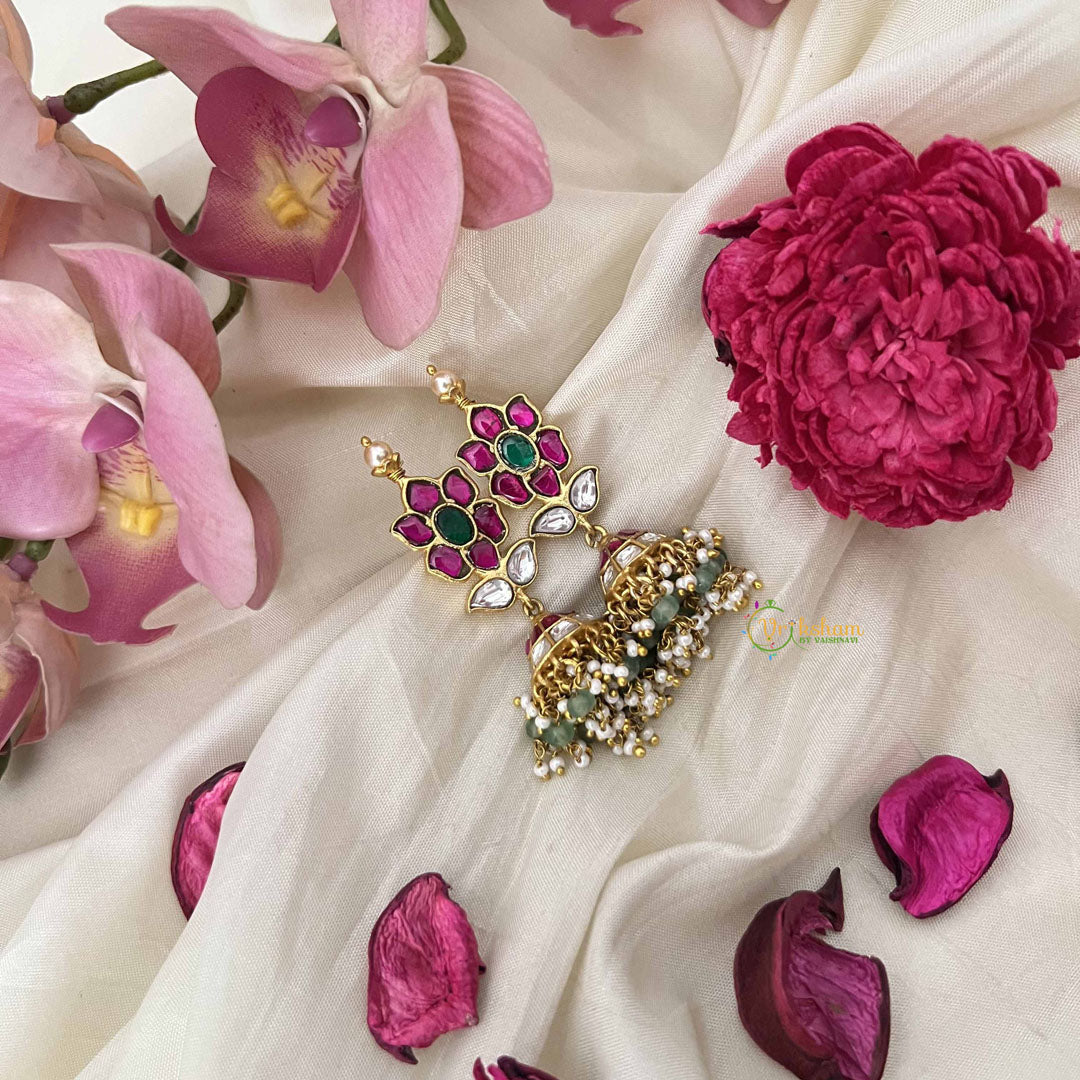 The Vriksham Lotus Motif Kundan Jadau Jhumkas showcase exquisite craftsmanship with a graceful lotus design accented by red, white, and green stones. Enhanced with green beads and pearls, these earrings bring a sophisticated charm that complements traditional attire beautifully, perfect for elevating your look at any festive or formal occasion.