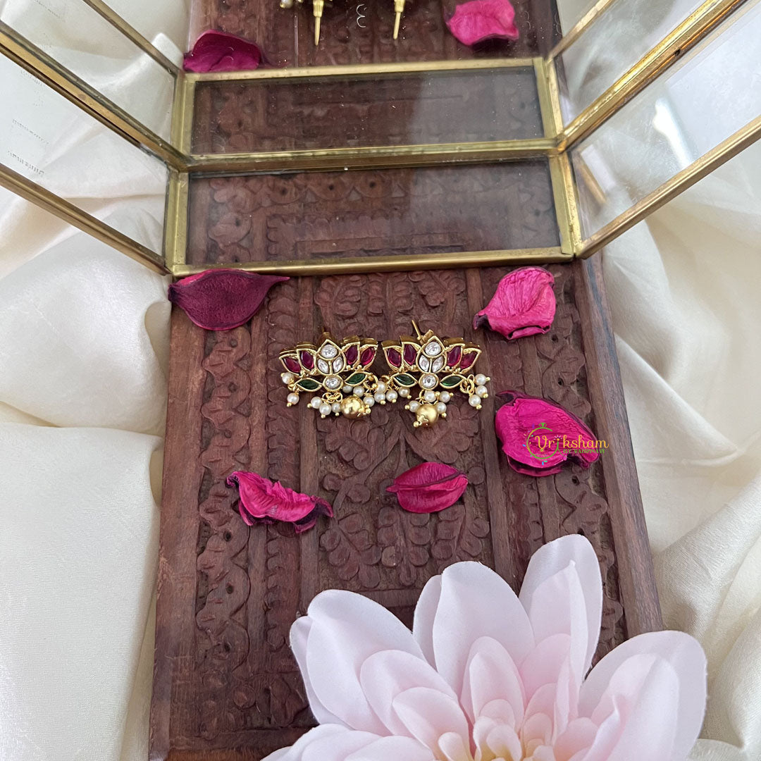 Exquisite lotus-inspired stud earrings featuring a harmonious blend of red, green, and white hues complemented by lustrous pearls. These meticulously crafted accessories embody timeless elegance while celebrating nature's perfect symmetry, offering a refined statement piece for both everyday sophistication and special occasions.