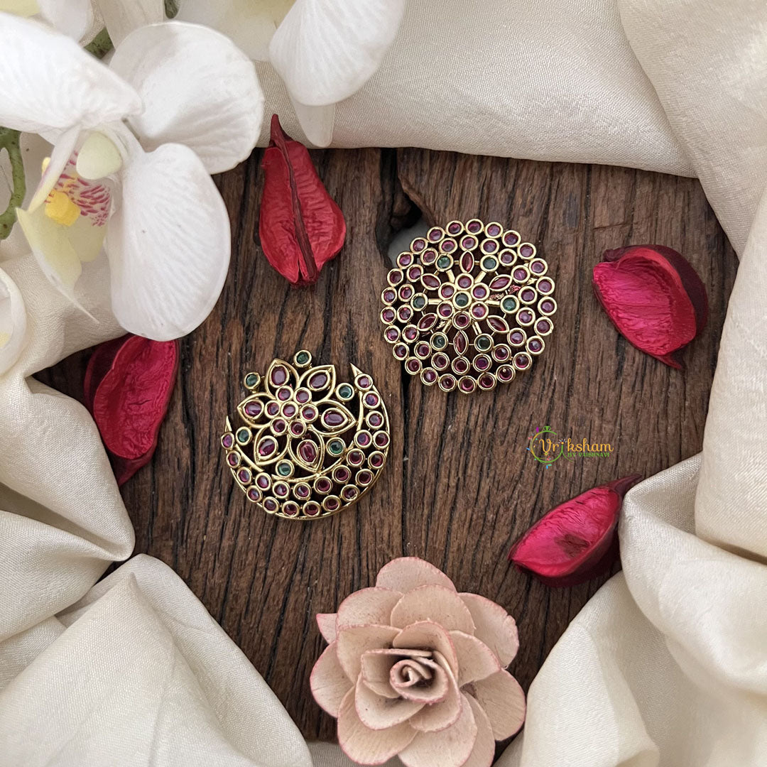 The Vriksham Lotus Style Chandran & Suryan Billai in green and red features an elegant lotus-inspired design that symbolizes purity and beauty. This sophisticated accessory combines vibrant colors with intricate craftsmanship, making it a perfect addition to elevate traditional and contemporary looks with subtle grace.