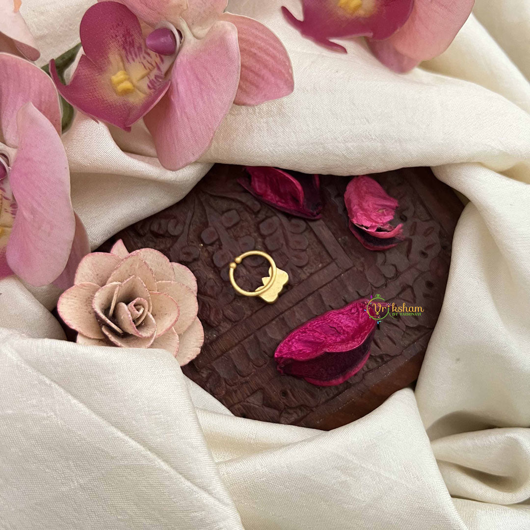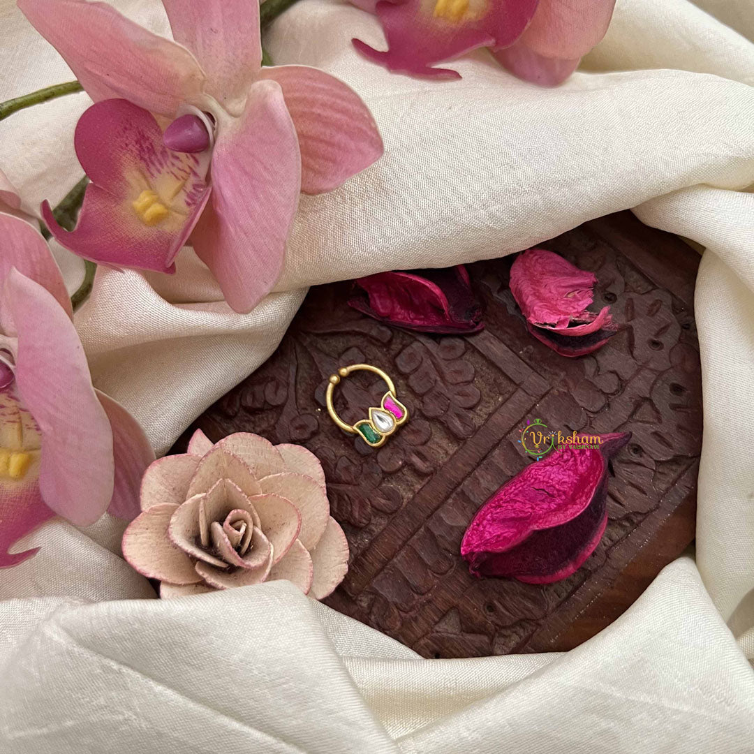 The Vriksham Lotus Style Gold-Toned Kundan Jadau Septum Ring, adorned with white, green, and red accents, beautifully captures the grace of the lotus design. Set in a luxurious gold tone with intricate kundan detailing, this sophisticated piece adds vibrant elegance and timeless cultural flair to any traditional ensemble.