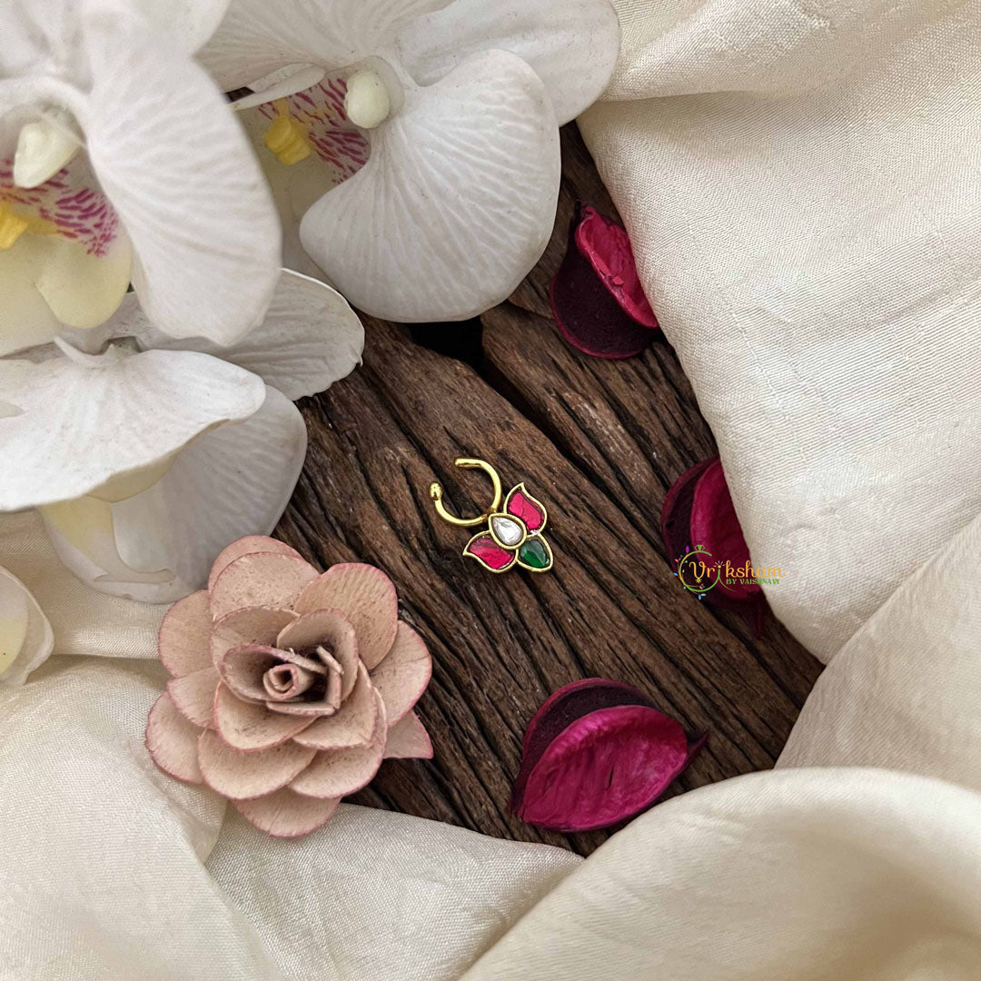 The Vriksham Lotus Style Golden Kundan Jadau Septum Ring features a gold-toned finish beautifully accented with red, green, and white stones. Inspired by the elegance of the lotus, this intricately designed piece combines traditional craftsmanship with vibrant hues, offering a sophisticated accessory that adds timeless charm and refined grace to any ensemble.