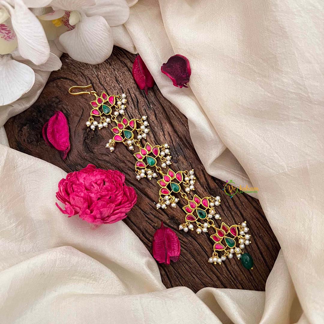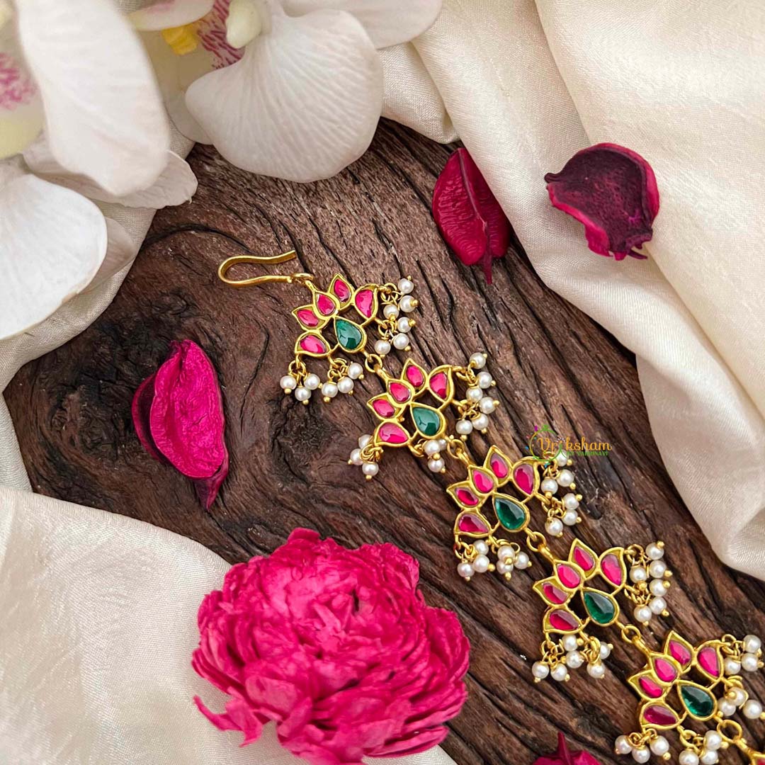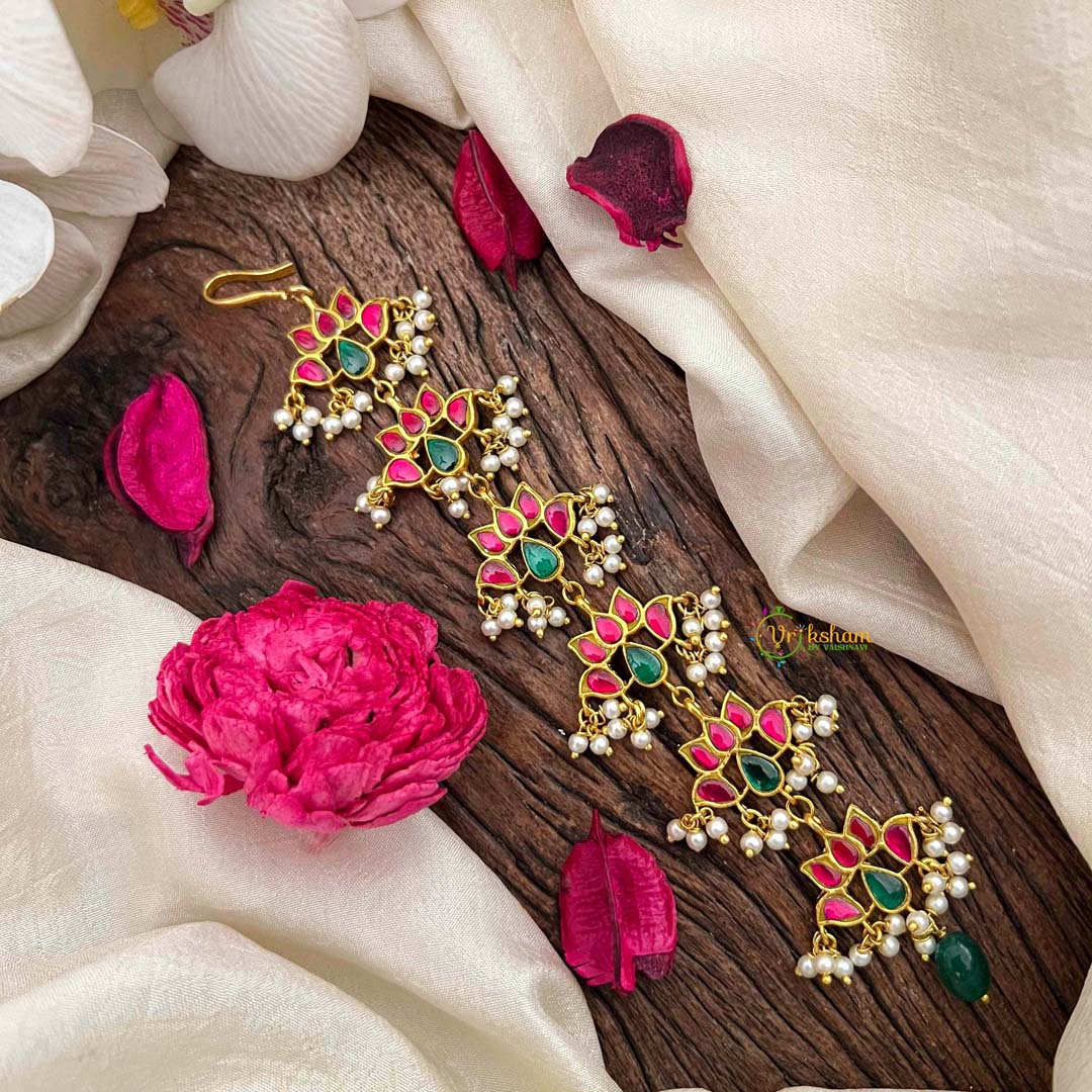 Discover refined elegance with this enchanting Lotus Style Kundan Jadau Jad Billai, a testament to traditional Indian jewelry artistry. Adorned with the sacred lotus motif, this piece harmonizes rich red and verdant green tones with luminous pearls set in intricate kundan work. Each gemstone is meticulously hand-placed using centuries-old techniques, creating a luminous interplay of light and color. Ideal for ceremonial occasions and festive celebrations, this sophisticated ornament embodies grace and cultural heritage. An heirloom-quality treasure that captures the essence of timeless beauty and artistic mastery.