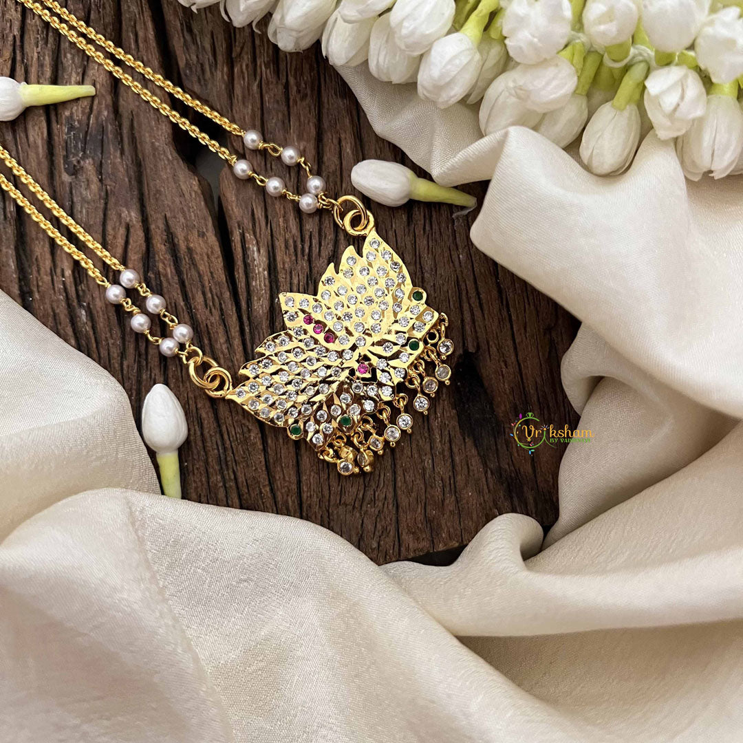 Discover the serene beauty of this exquisite Lotus-inspired pendant, a symbol of purity and spiritual awakening. This refined creation features a graceful lotus design embellished with sparkling diamond drops and resplendent AD stones, complemented by two layers of lustrous pearls. The gold-plated setting elevates the piece with warm, luxurious tones, while the tricolor mala in white, red, and green represents harmony, prosperity, and vitality. Meticulously crafted for those who appreciate meaningful jewelry, this pendant seamlessly blends sacred symbolism with contemporary sophistication. Whether worn for spiritual practice or as a statement of refined taste, it serves as a timeless expression of inner grace and cultural reverence.