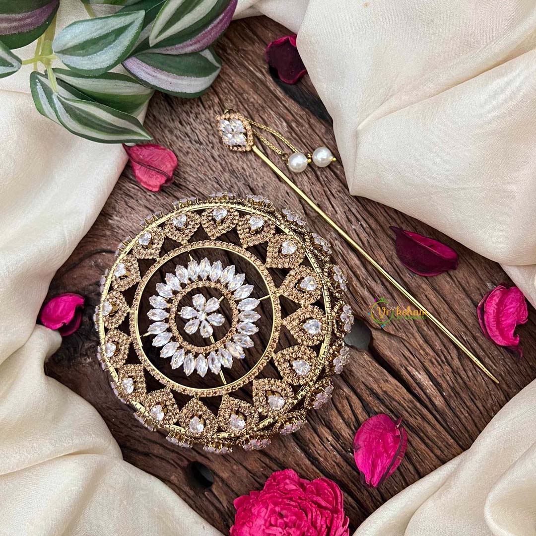 Experience contemporary glamour with this exclusive blackish gold-plated hair bun cage, featuring an array of sparkling cubic zirconia stones set in an intricate design. The distinctive blackish gold finish delivers a bold, modern aesthetic that stands apart from conventional options, making it ideal for those seeking a statement piece with understated drama. The strategically positioned CZ stones create a mesmerizing interplay of light and shadow, adding depth and dimension to your styled bun. Engineered for both security and comfort, this accessory transitions effortlessly from evening events to sophisticated daytime wear. A luxurious addition to your collection that celebrates individuality and refined taste.