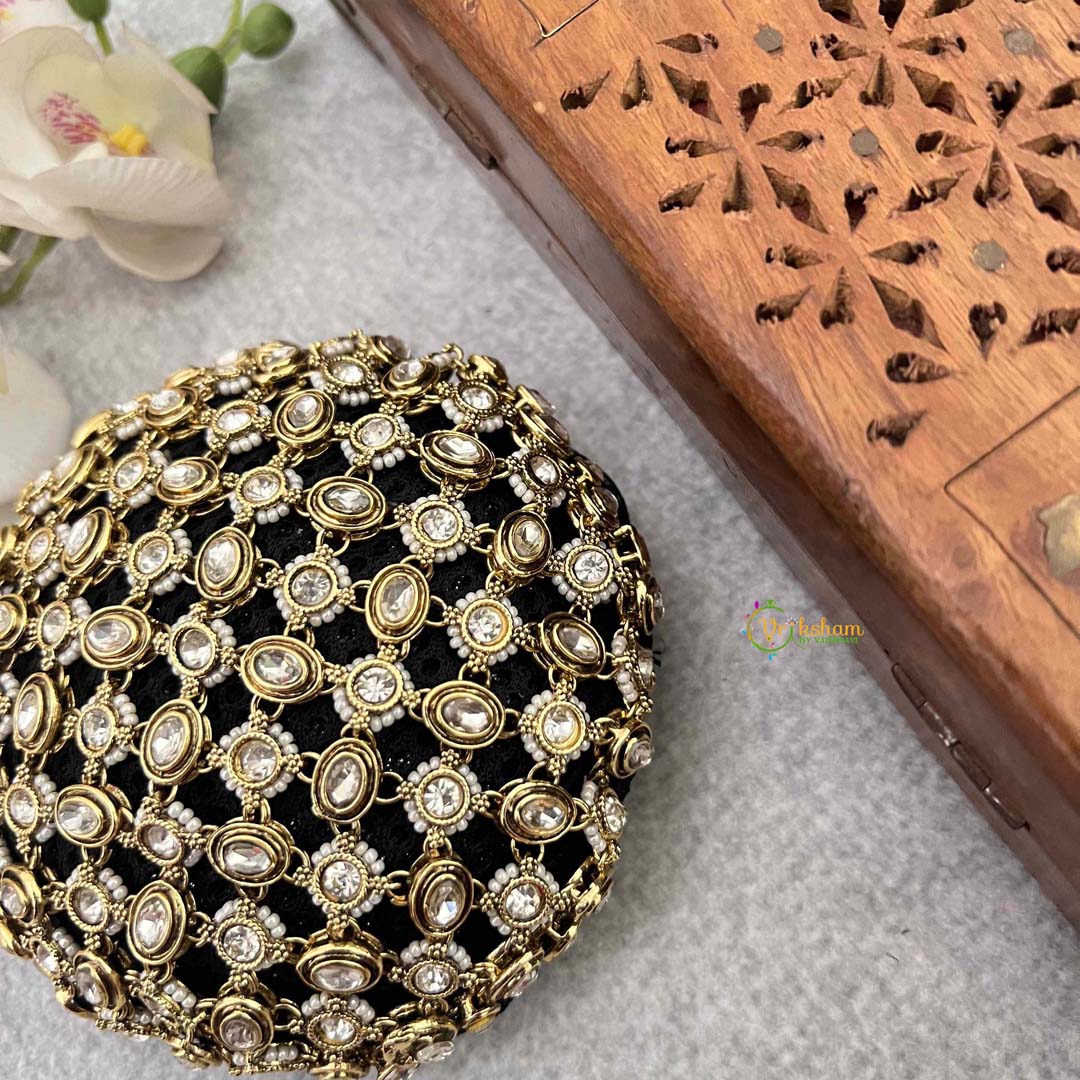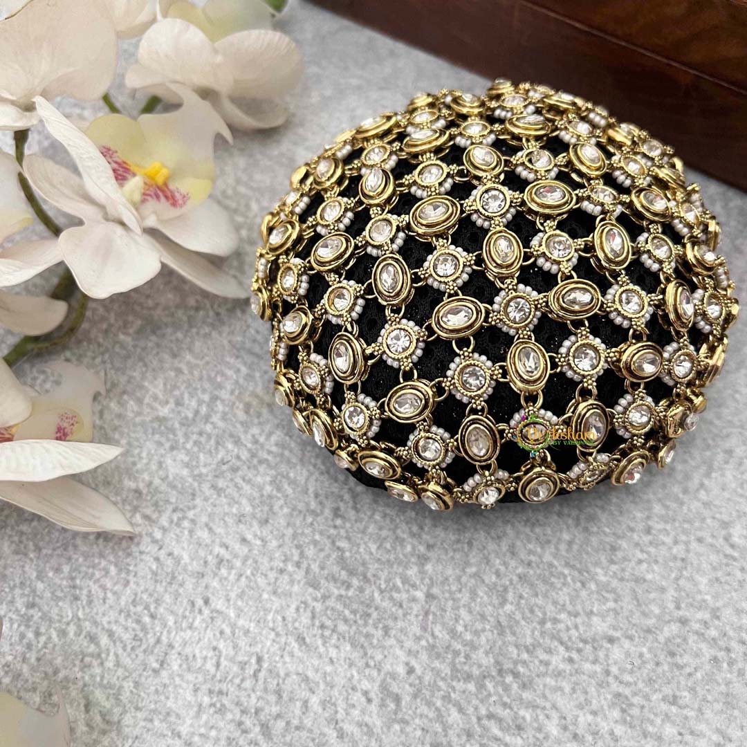Experience radiant splendor with this Grand Kundan Sunburst & Floral Style Hair Bun Cover, a breathtaking fusion of traditional artistry and contemporary elegance. Featuring an impressive sunburst motif adorned with intricate kundan work and delicate floral embellishments, this accessory commands attention with its luminous presence. The robust hair bun cage provides secure anchoring while the ornate cover elevates your hairstyle to gallery-worthy status. Perfect for grand celebrations, ceremonial occasions, and those who desire to make a distinguished impression, this piece embodies the pinnacle of refined taste and cultural sophistication.