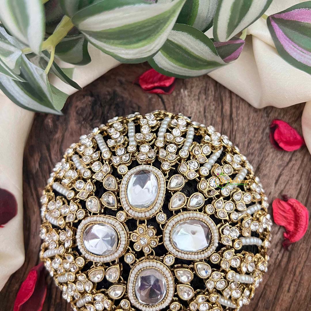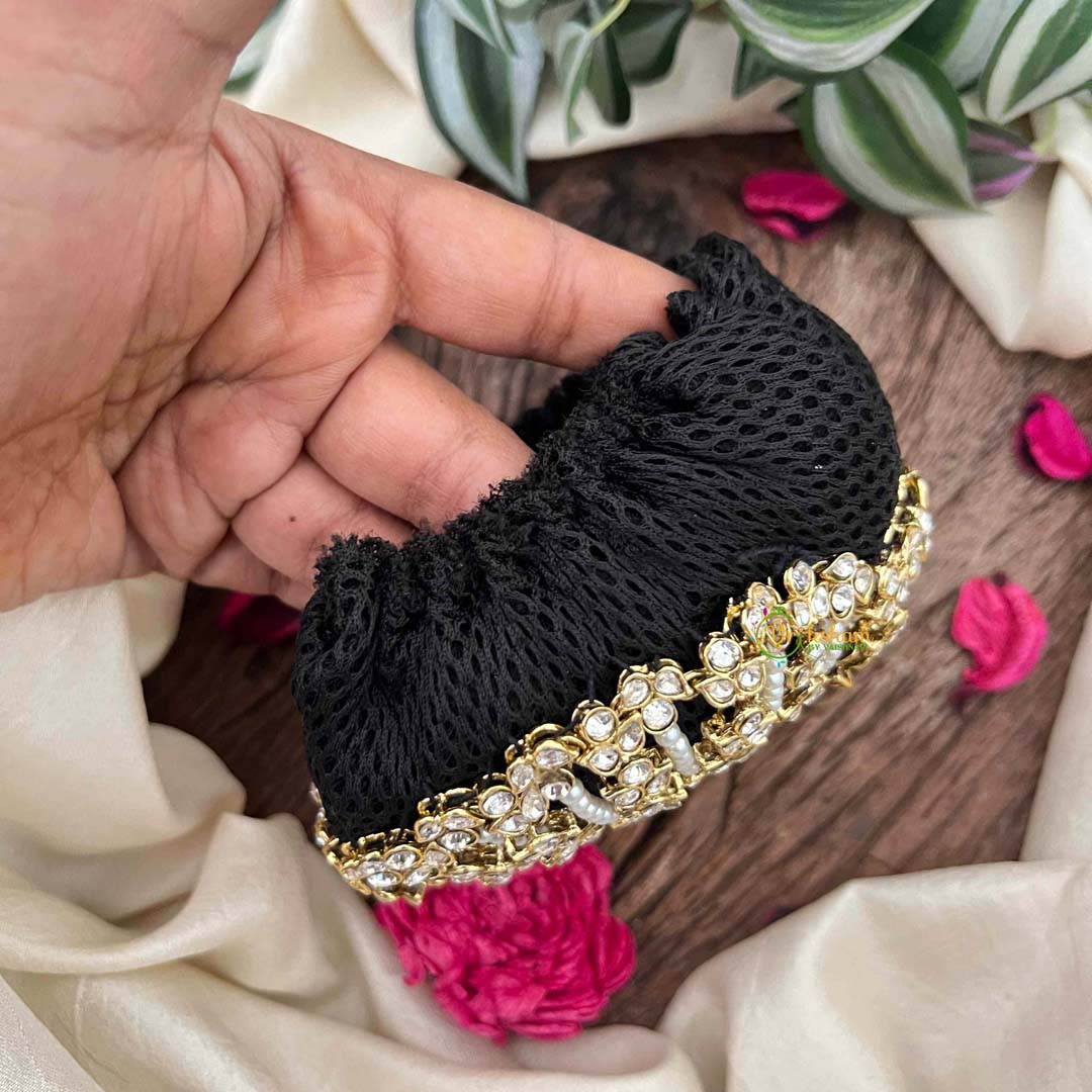 Indulge in opulent craftsmanship with this luxury bun net, where traditional artistry meets contemporary elegance. Adorned with lustrous kundan stones and lustrous pearls, each piece is meticulously studded to create a radiant, jewel-like finish that catches light beautifully. The dual-function design serves as both a decorative bun cage and a secure net, accommodating various bun styles while maintaining its refined aesthetic. Perfect for bridal occasions, festive celebrations, or those who appreciate heirloom-quality accessories, this piece transforms your hair into a crown of sophistication and timeless beauty.