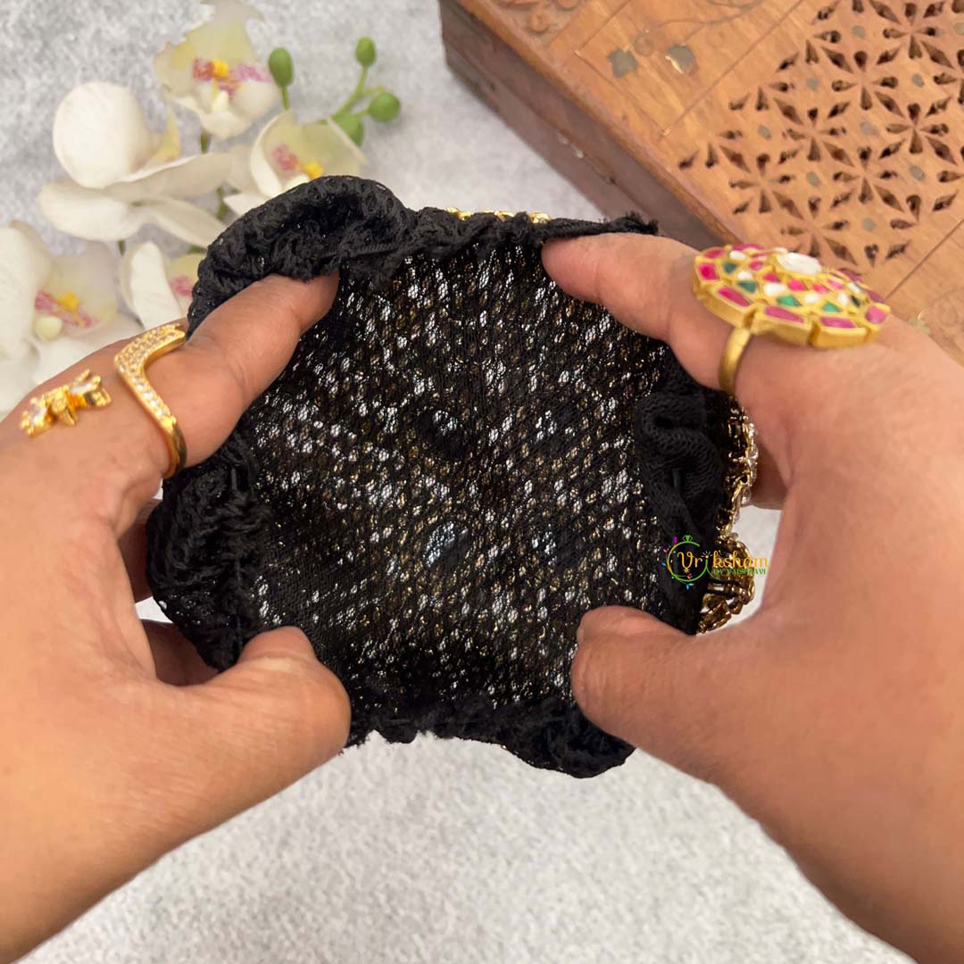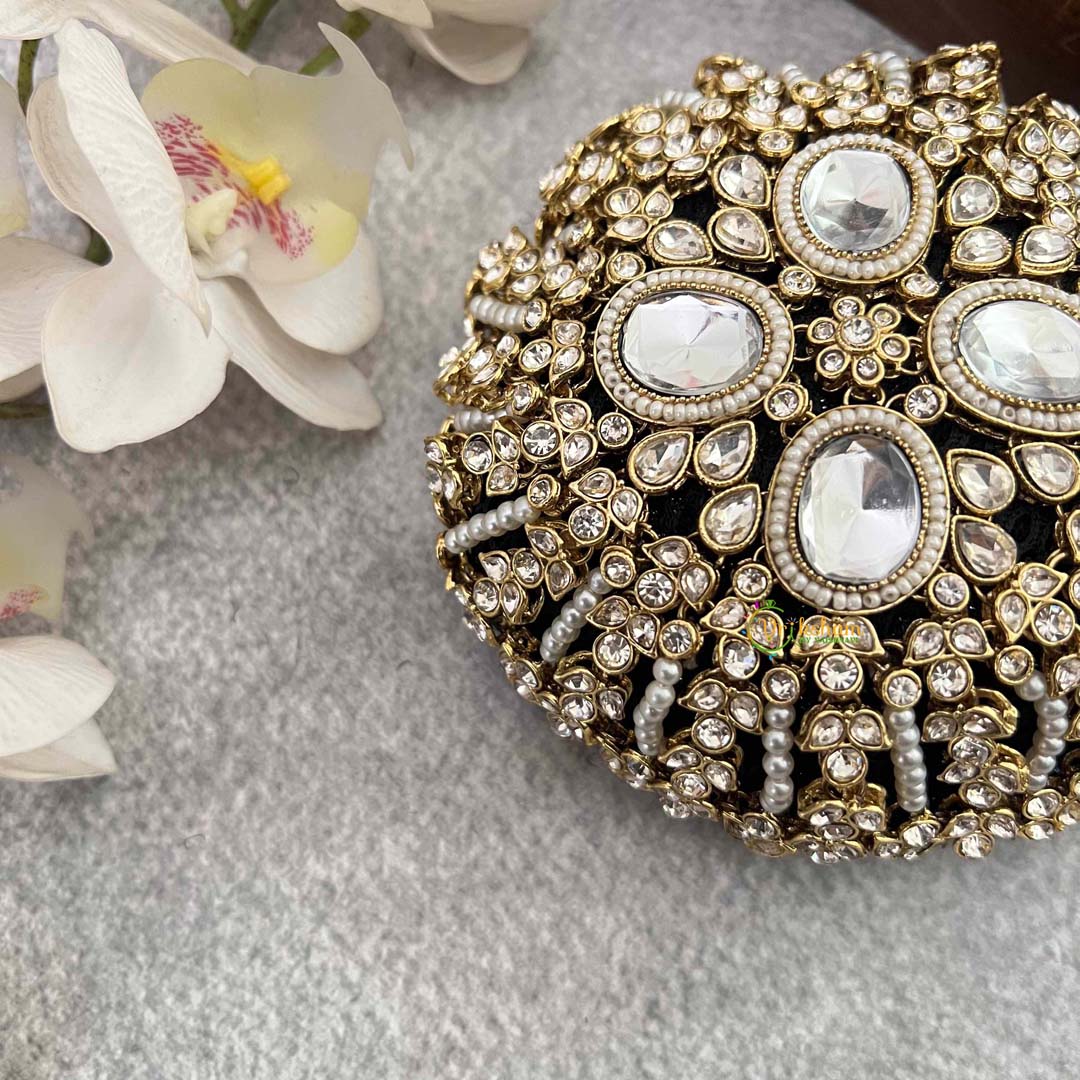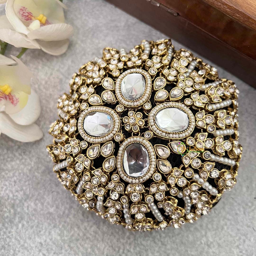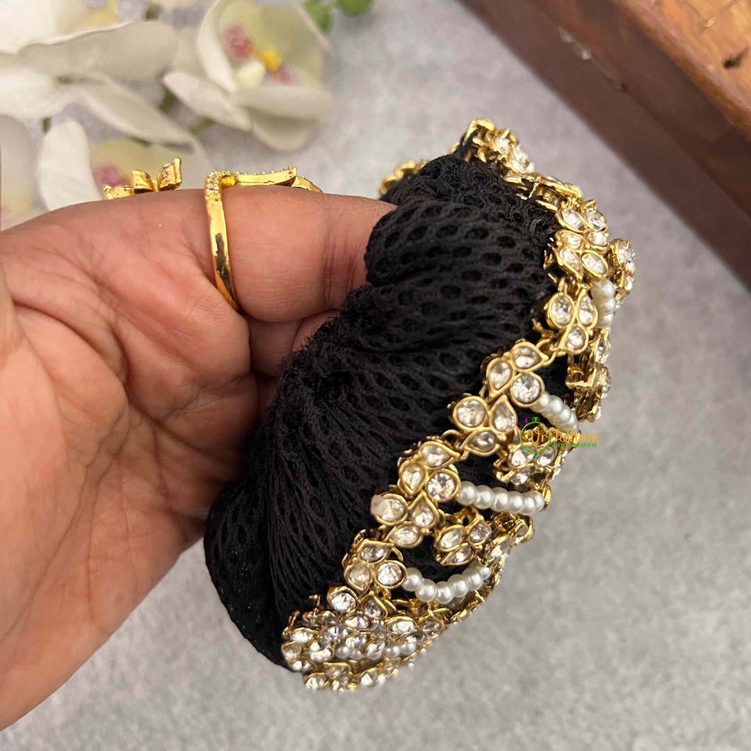 Indulge in opulent craftsmanship with this luxury bun net, where traditional artistry meets contemporary elegance. Adorned with lustrous kundan stones and lustrous pearls, each piece is meticulously studded to create a radiant, jewel-like finish that catches light beautifully. The dual-function design serves as both a decorative bun cage and a secure net, accommodating various bun styles while maintaining its refined aesthetic. Perfect for bridal occasions, festive celebrations, or those who appreciate heirloom-quality accessories, this piece transforms your hair into a crown of sophistication and timeless beauty.