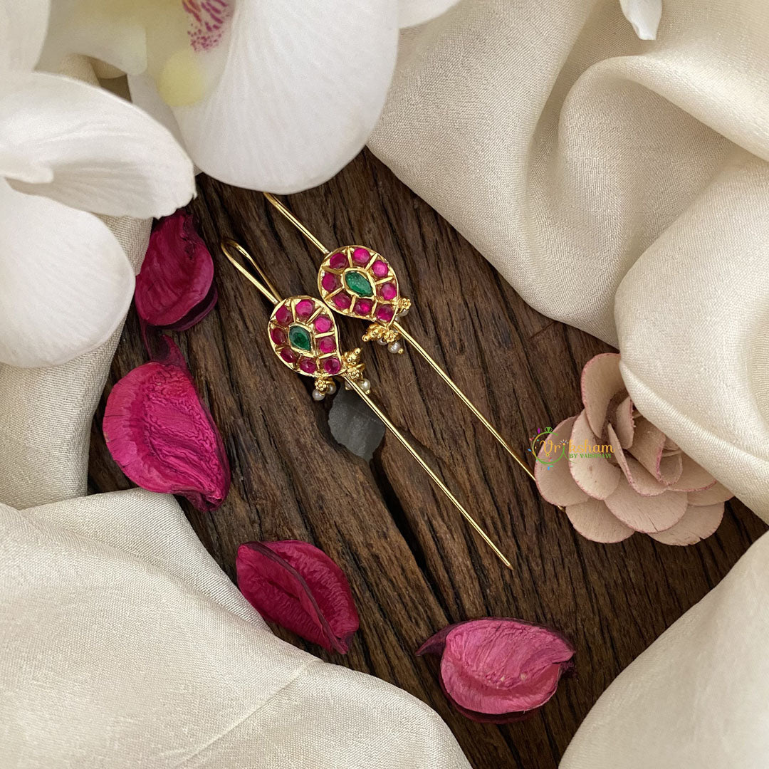 Transform your look with these exquisite Vriksham Maanga Bugadi Style Earrings. The bold red and green design, accented with shimmering pearls, adds a touch of elegance to any outfit. Upgrade your style with these premium earrings and make a statement wherever you go.
