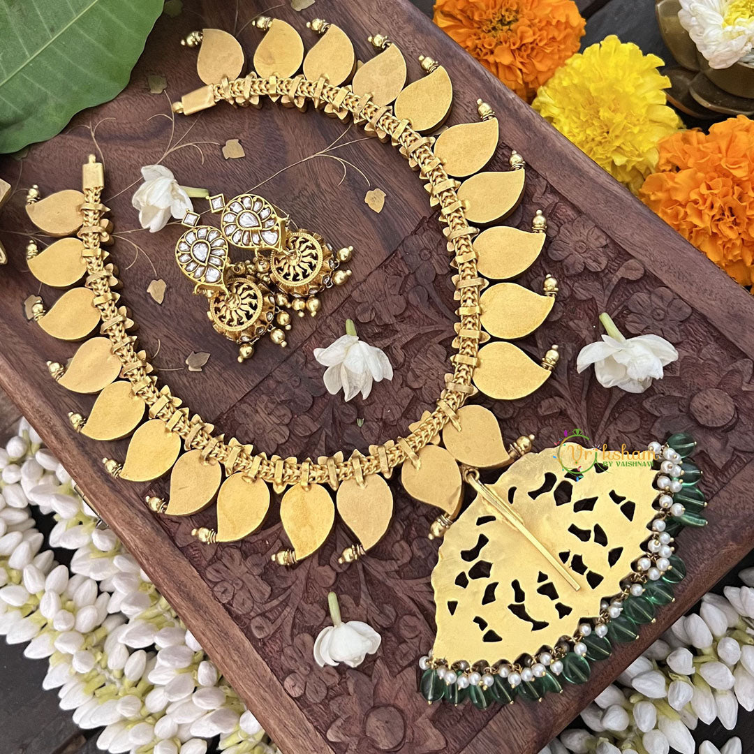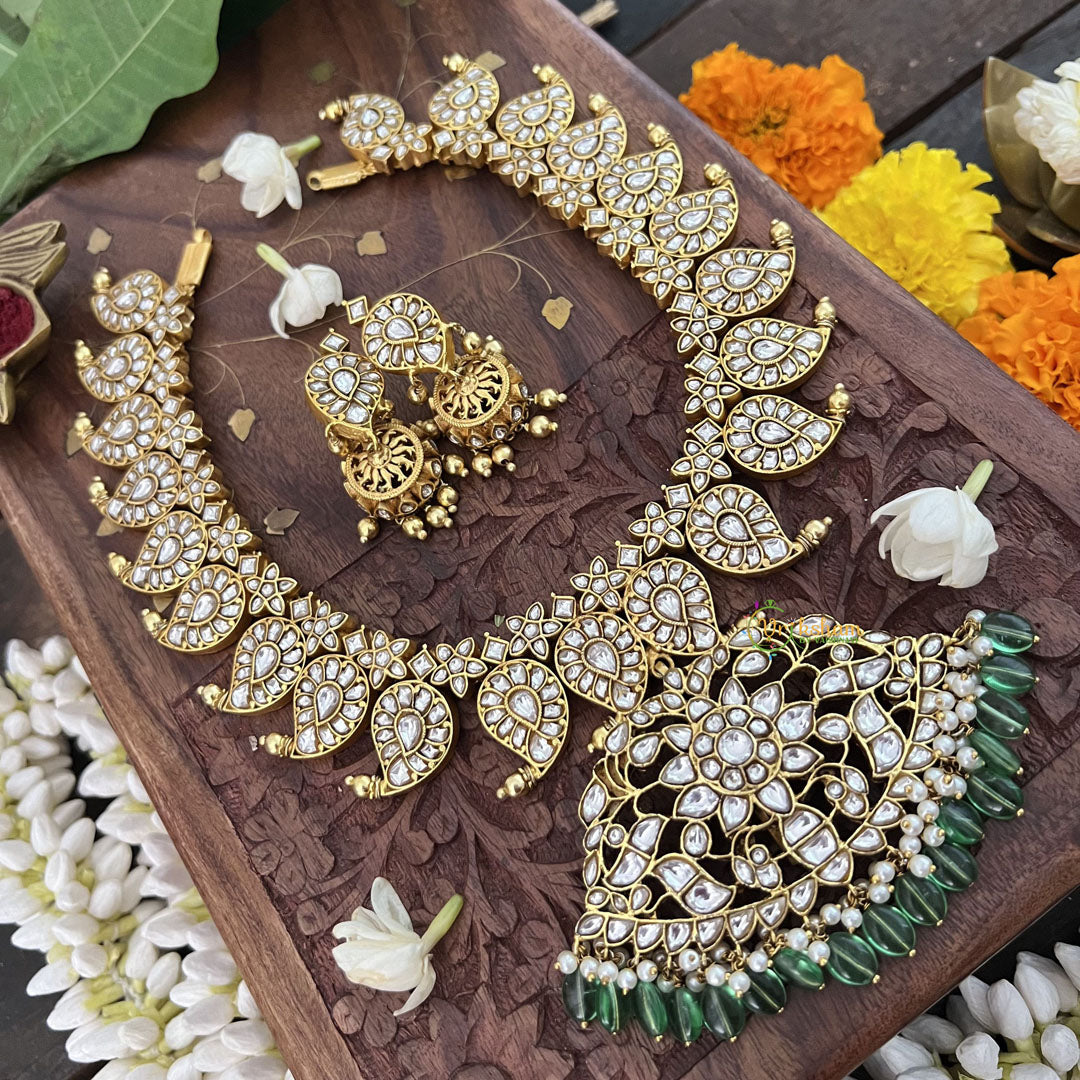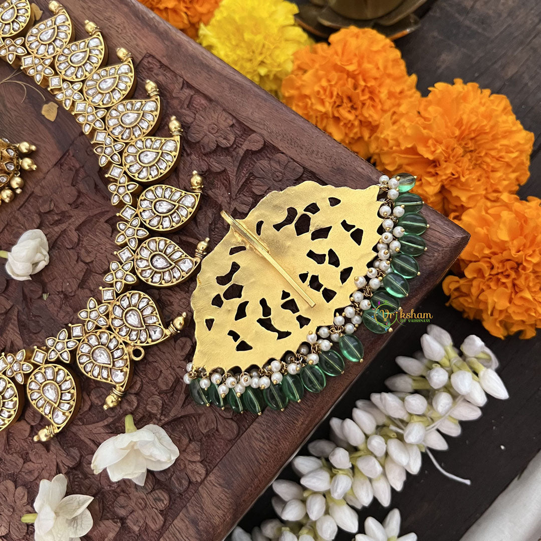 The Vriksham Maanga Style Kundan Jadau Short Neckpiece combines delicate white and aqua green beads with lustrous pearls, creating a refined and graceful accessory. Its intricate Kundan craftsmanship adds a timeless elegance, perfect for enhancing your ensemble with subtle sophistication and charm.