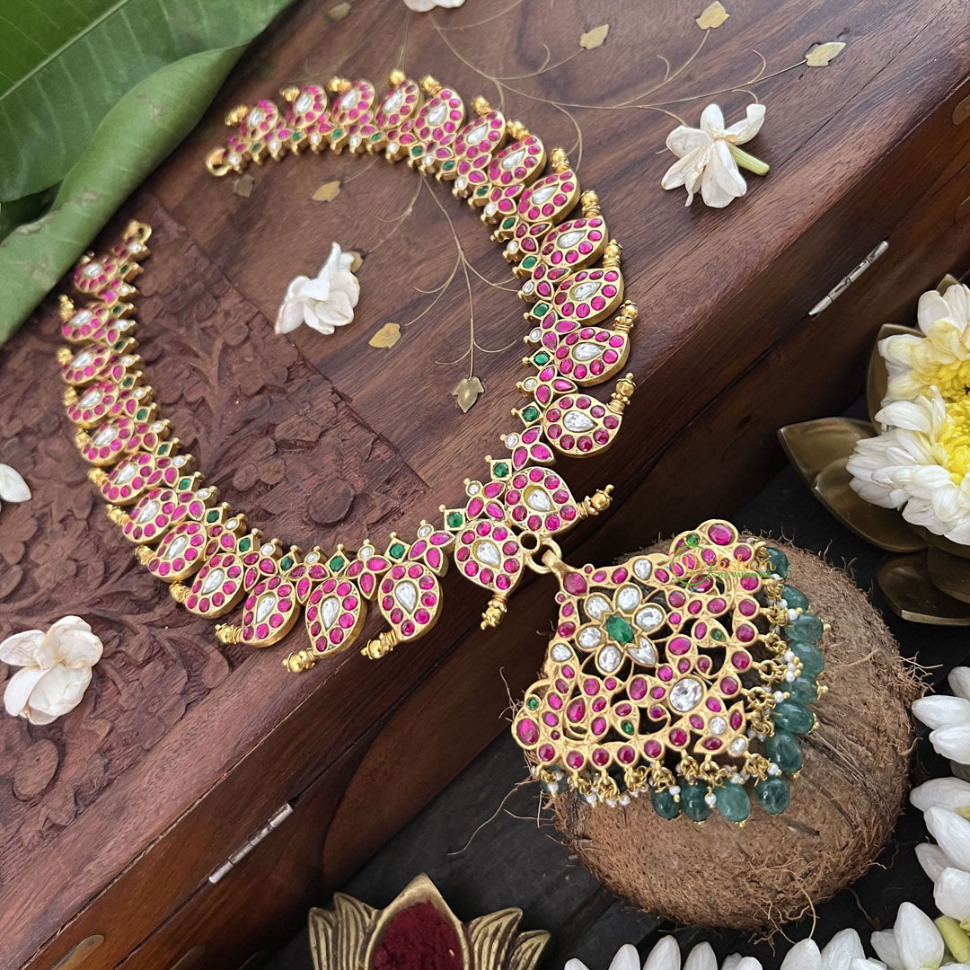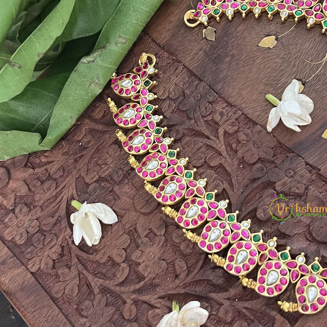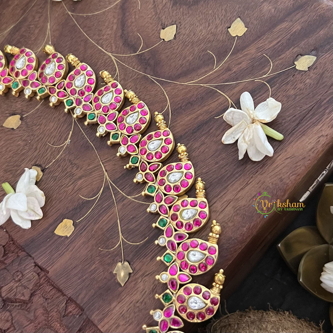 Elevate your elegance with the Vriksham Maanga Style Reversible Neckpiece, featuring exquisite red and white Kundan Jadau work. This versatile piece showcases intricate craftsmanship with gold bead accents, allowing you to switch between two stunning looks effortlessly. Perfect for special occasions, it adds a refined touch to any ensemble while reflecting timeless tradition and modern sophistication.