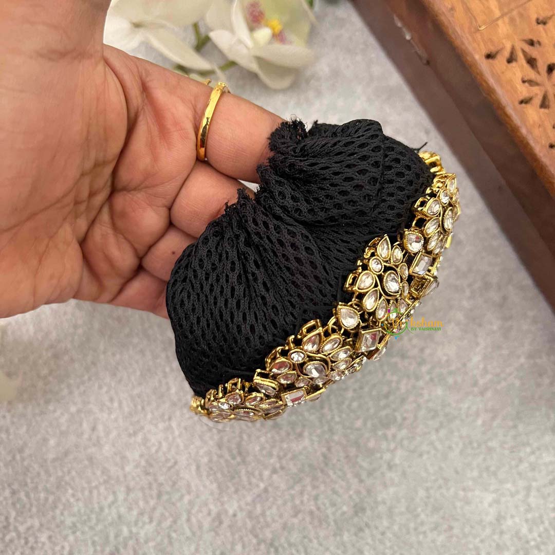 Embrace regal elegance with this majestic floral polki hair bun cage, where botanical artistry meets timeless jewelry craftsmanship. The intricate floral motifs, adorned with authentic polki stones, create a captivating interplay of light and shadow that enhances your hairstyle with natural grace. Ideal for festive occasions, weddings, and celebrations, this accessory brings an air of majesty to traditional and contemporary ethnic wear alike. Each carefully placed stone reflects the artisan's dedication to creating a piece that speaks to those with refined taste and an appreciation for heritage-inspired beauty.