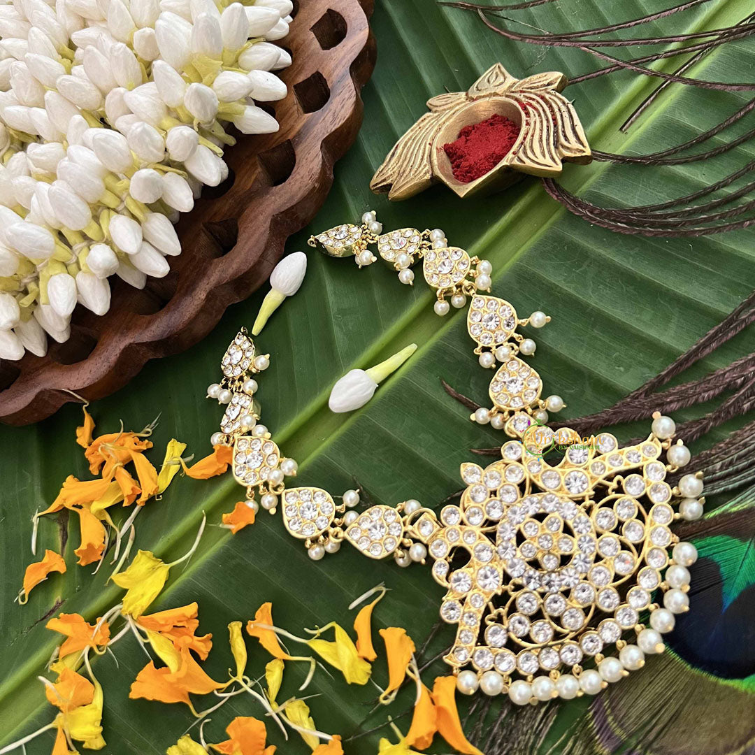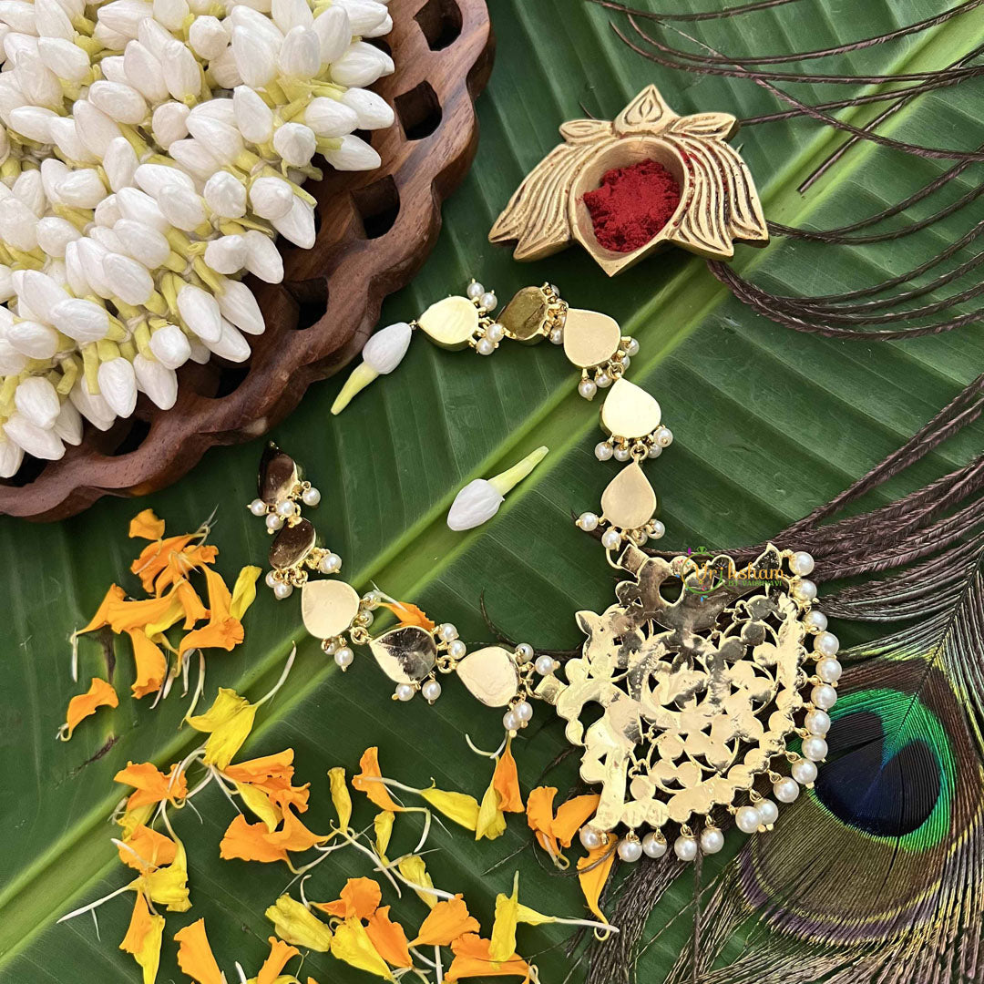 The Vriksham Majestic Polki Gold Look Precious Kemp With Pearl Short Neckpiece exudes timeless elegance with its intricate Polki design and rich gold finish. Accented by vibrant kemp stones and lustrous pearls, this short neckpiece offers a sophisticated statement, perfect for elevating your special occasion ensemble with regal charm and refined craftsmanship.