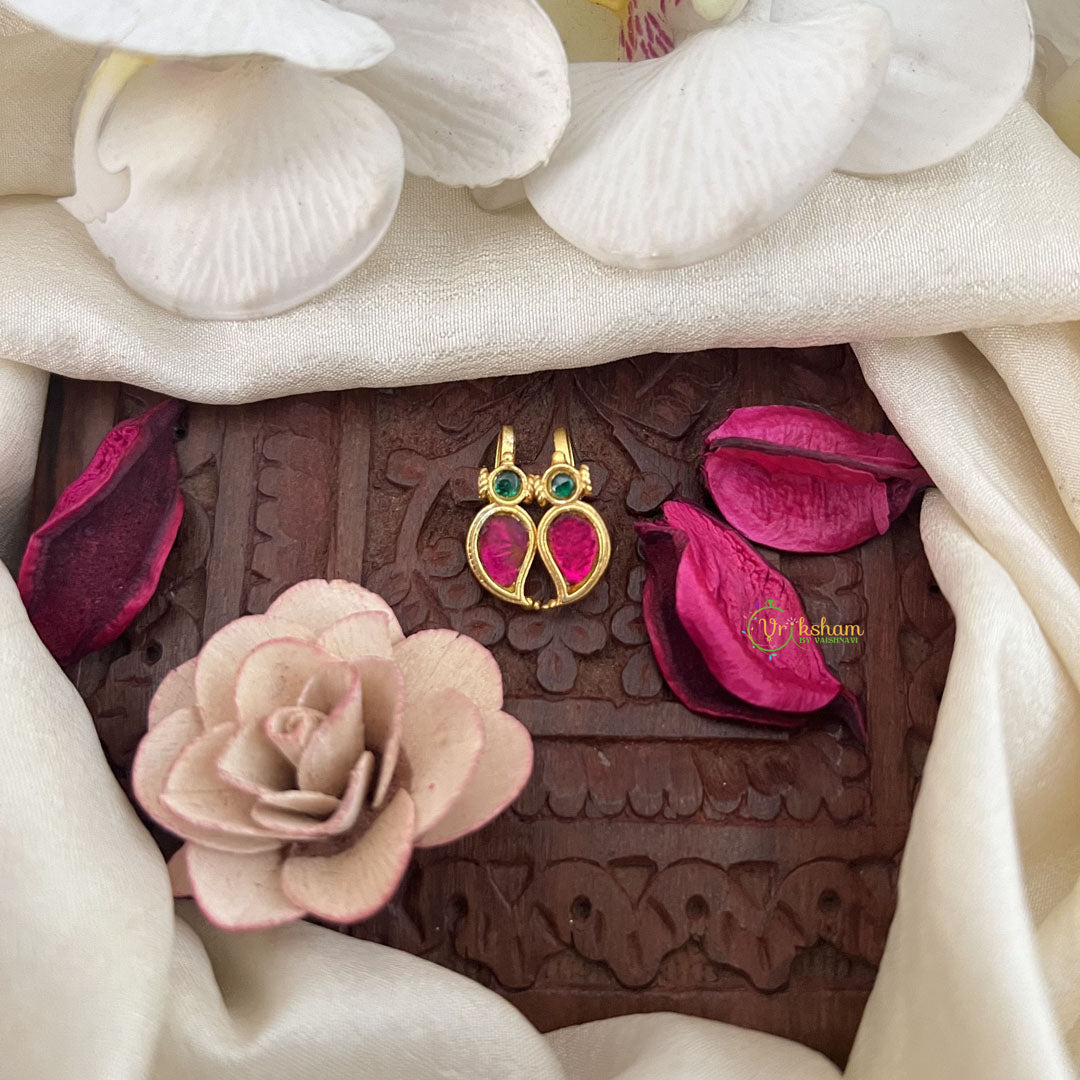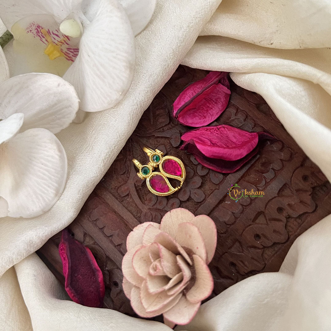 The Vriksham Manga Style Kundan Jadau Press Bugadi in green and red showcases intricate kundan and jadau craftsmanship inspired by traditional manga motifs. This elegant accessory adds a sophisticated touch to your ethnic attire, perfect for elevating your look on festive and special occasions with timeless grace.