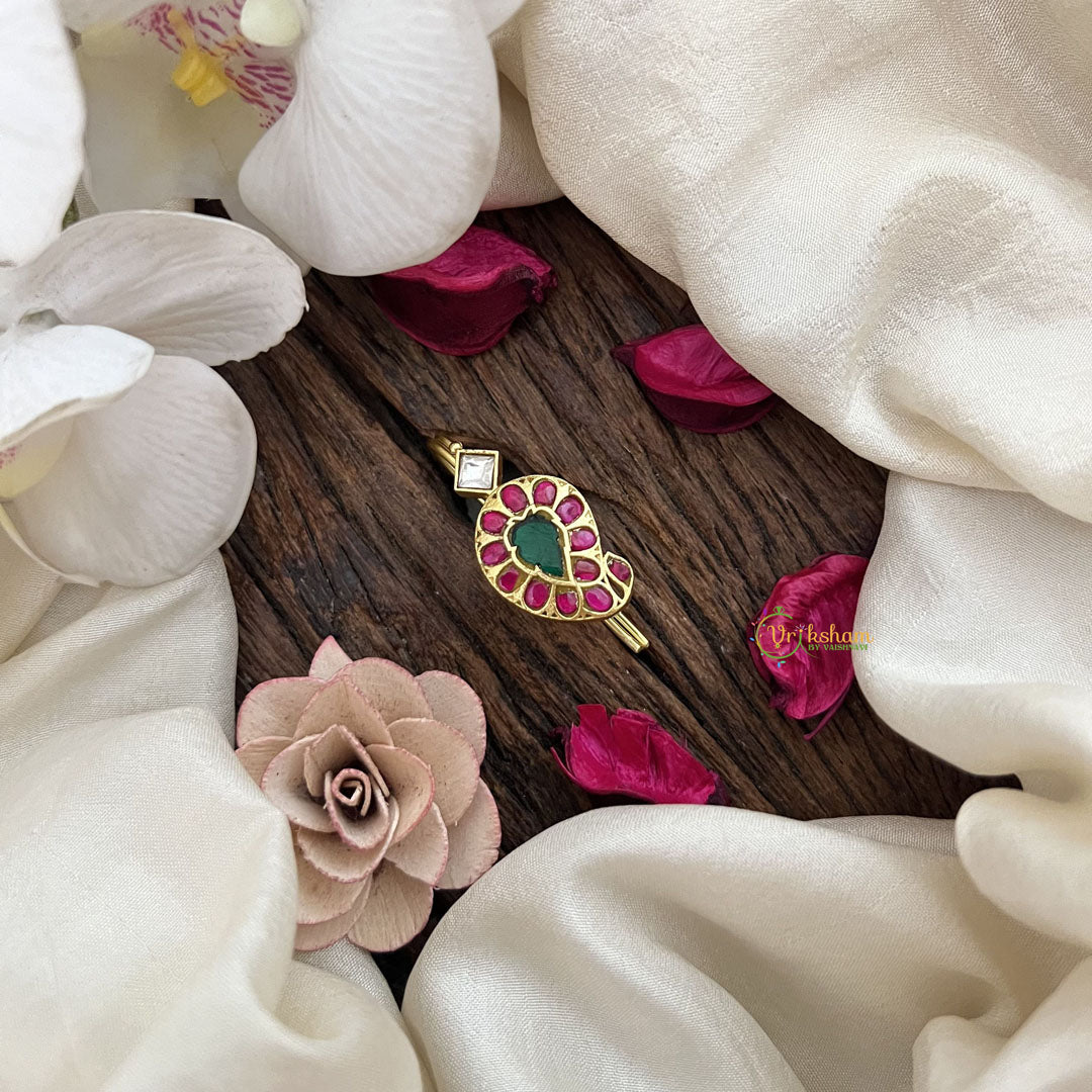 The Vriksham Mango Style Jadau Kundan Jada Billai in Green, White, and Red features exquisite craftsmanship with a timeless mango motif. Enhanced by a harmonious blend of colors, this sophisticated piece combines traditional Jadau and Kundan artistry, offering elegant charm