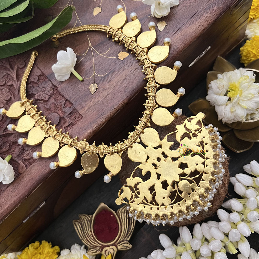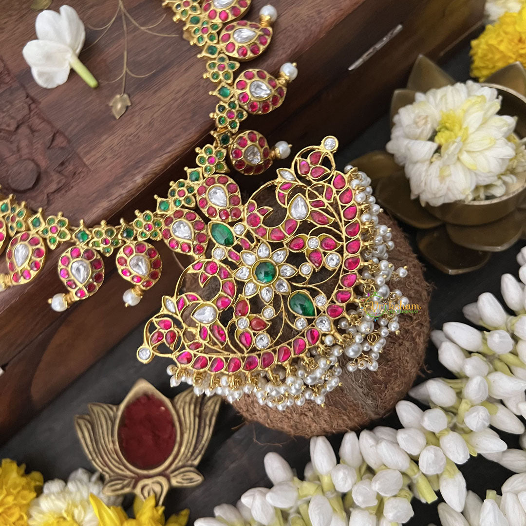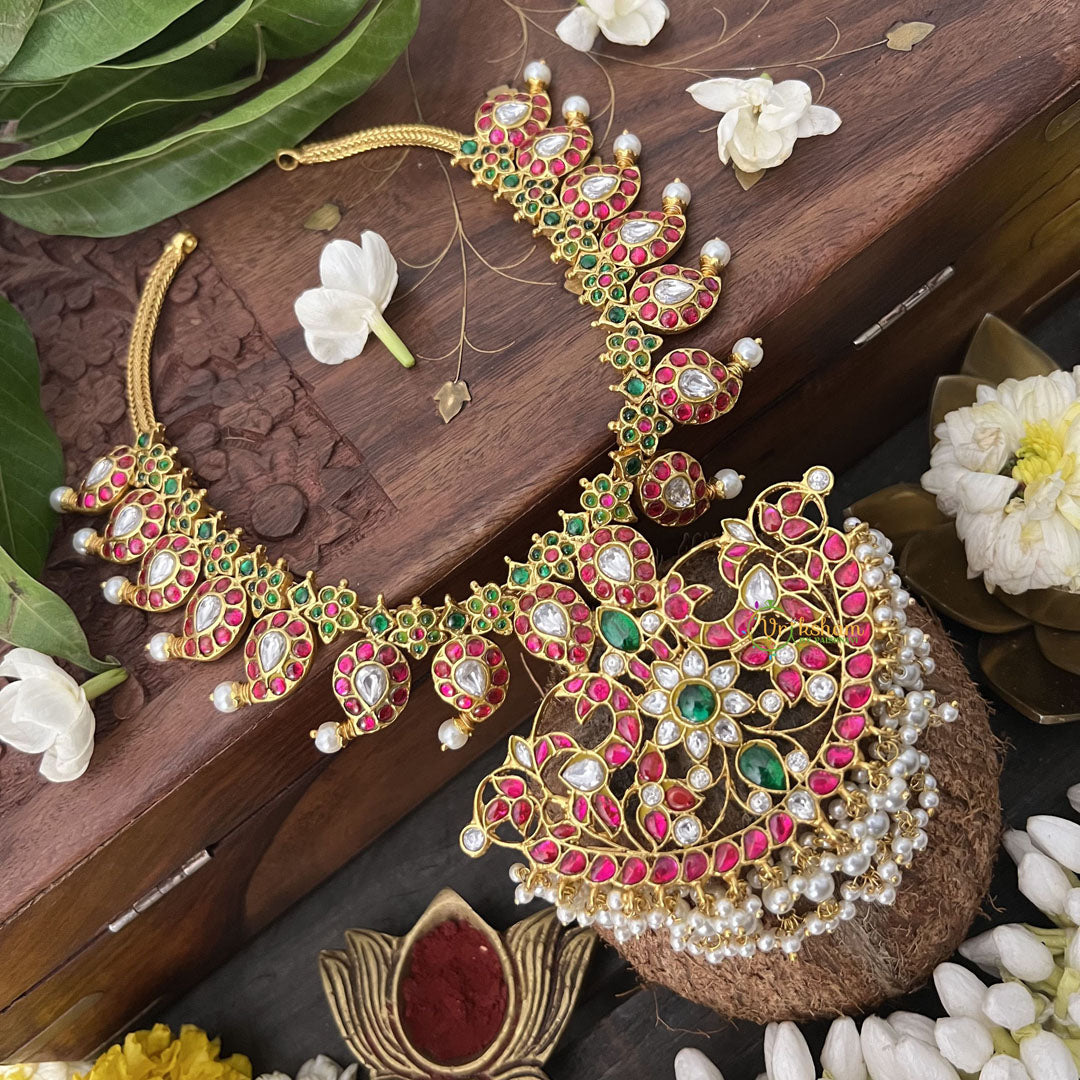 The Vriksham Mango Style Kundan Jadau Neckpiece features a sophisticated blend of red and green stones accented with lustrous pearls. Its elegant mango-inspired design highlights intricate craftsmanship, making it a timeless accessory that adds grace and refined beauty to your traditional ensemble.