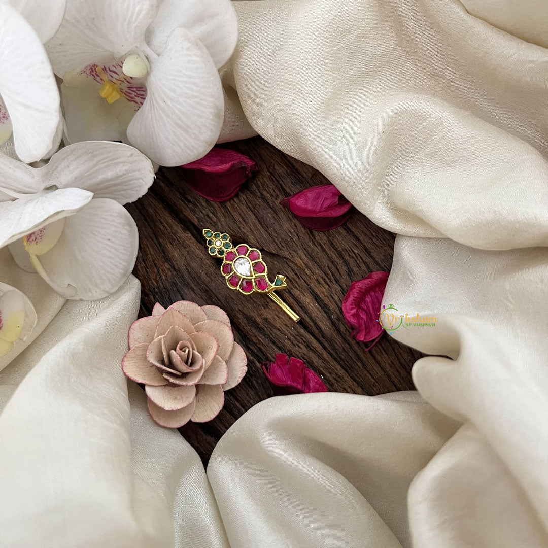 The Vriksham Mango Style With Floral Jadau Kundan Jada Billai in White, Red, and Green combines intricate mango motifs with delicate floral designs. Crafted using traditional Jadau and Kundan techniques, this sophisticated piece offers a harmonious blend of colors and timeless elegance, perfect for enhancing any refined jewelry collection.