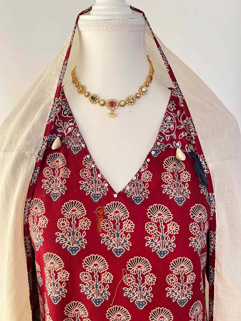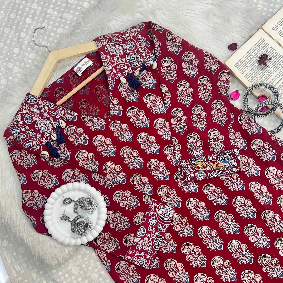 Embrace timeless elegance with our Maroon Ajrakh Hand-Block Print Kurta 3 Piece Set. This exquisite ensemble features authentic hand-block printed ajrakh on pure cotton, adorned with delicate cowrie shell and tassel embellishments that add a touch of traditional charm. The set includes a beautifully printed kurta top, coordinating bottom, and a flowing dupatta—each measuring 2.4 meters. The rich maroon tones and intricate ajrakh patterns showcase the artistry of traditional Indian textile craftsmanship, making it perfect for festive occasions, celebrations, or everyday elegance. Key Features: Material: Pure cotton kurta with organza dupatta for comfort and grace Design: Hand-block printed ajrakh with cowrie shell and tassel details Set Contents: Separate top, bottom, and dupatta pieces Weight: 600 gm Care: Gentle hand wash only; do not machine wash or mix with other colors Perfect for those who appreciate authentic handcrafted textiles and traditional Indian aesthetics. Each piece is unique, reflecting the natural variations inherent in hand-block printing. Note: Colors and shades may vary slightly from photographs due to natural lighting and the handmade nature of the product.