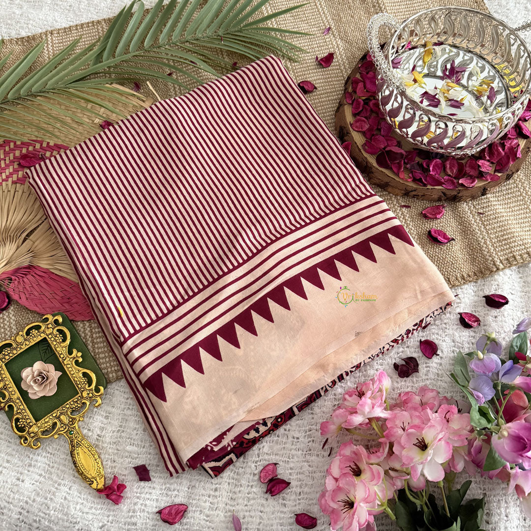 Indulge in pure luxury with our Vriksham Marron With Stirped Print Ajrakh Modal Silk Saree. Handcrafted with exquisite attention to detail, this saree boasts a unique ajrakh modal design, making it a true masterpiece. Made with premium quality silk, it drapes elegantly and will elevate your wardrobe to new heights.