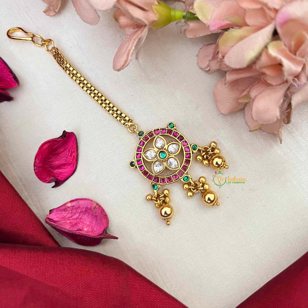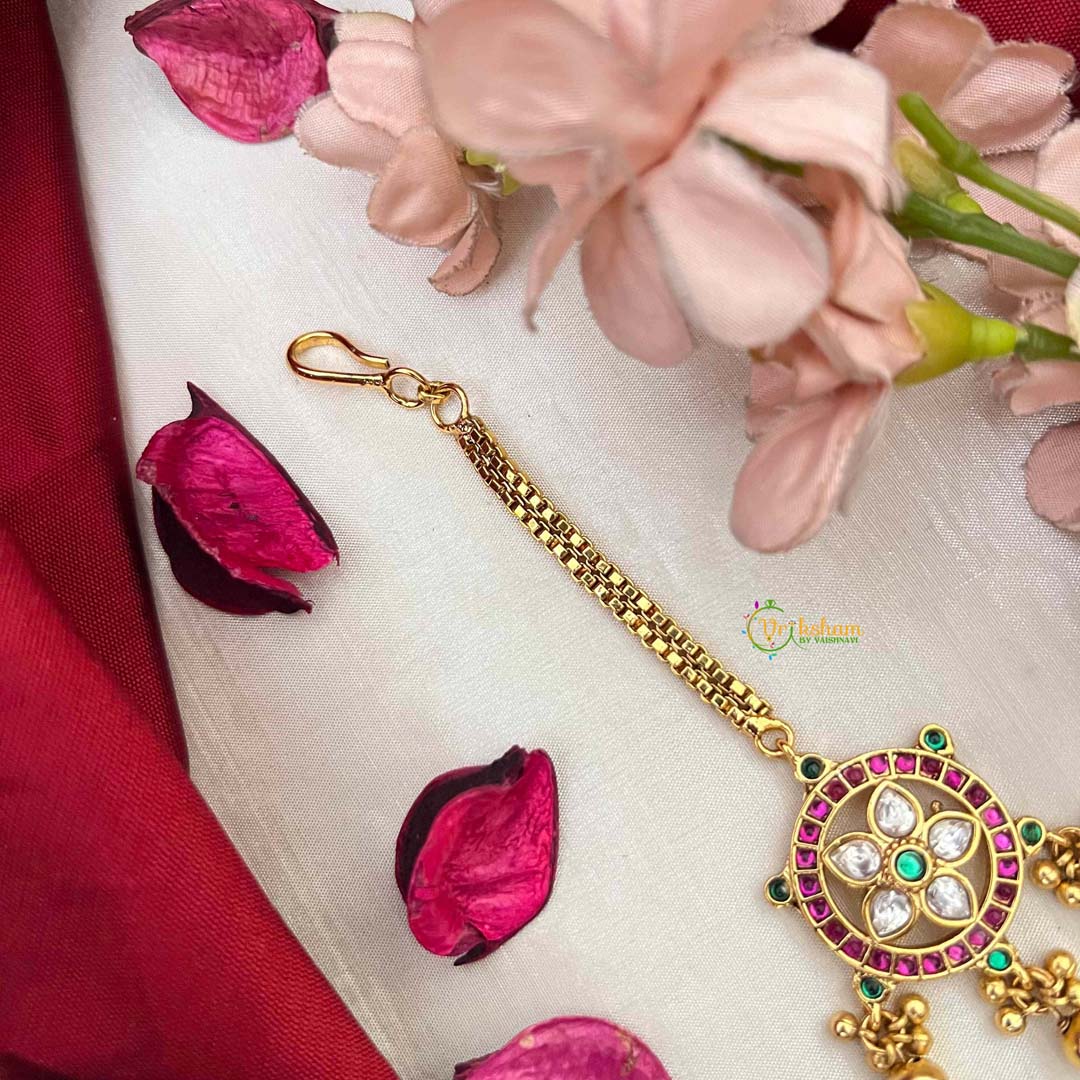 Adorn yourself with this refined maang tikka, crafted with meticulous attention to detail. The matte gold finish provides a subtle, luxurious sheen, while the circular gold-work design showcases traditional artistry at its finest. Embellished with striking red, green, and white gemstones paired with an elegant gold bead, this piece radiates timeless beauty. Ideal for brides and those seeking jewelry that harmonizes cultural significance with contemporary grace, this maang tikka is a cherished addition to any festive or ceremonial occasion.