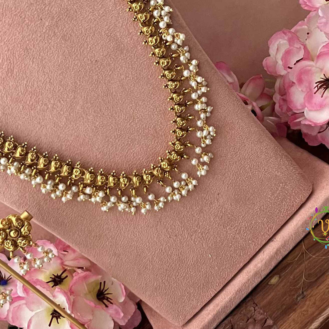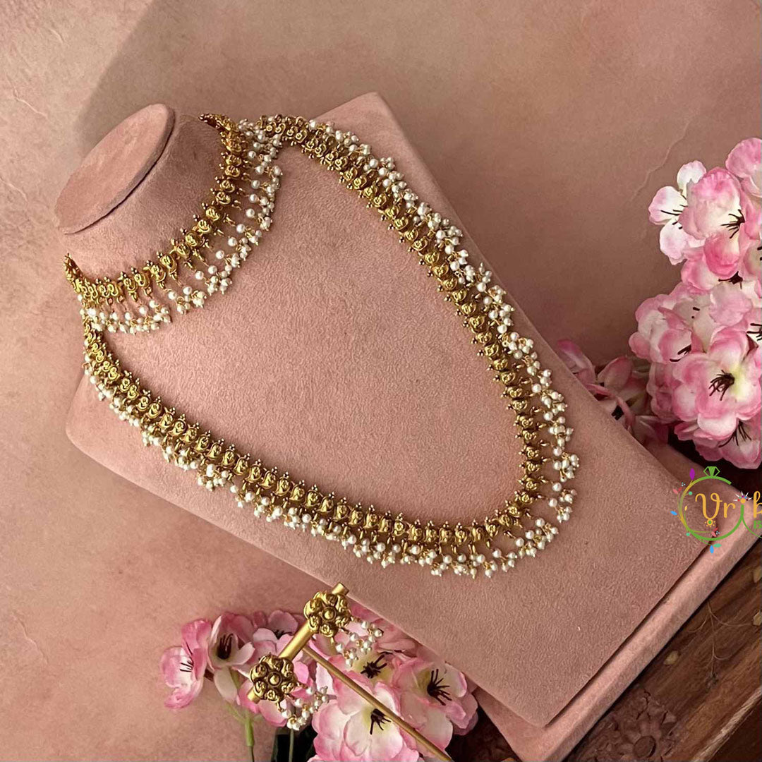 Experience understated refinement with this minimalist bridal set, featuring a graceful gold-plated peacock guttapusalu adorned with lustrous pearls. The streamlined design celebrates the beauty of simplicity while honoring traditional South Indian jewelry aesthetics. Each piece combines contemporary minimalism with classic craftsmanship, creating an effortlessly elegant collection perfect for modern brides who appreciate subtle sophistication. The peacock motif symbolizes beauty and grace, while the pearl accents add timeless luminosity. An ideal selection for those seeking jewelry that speaks through restraint and refined artistry.