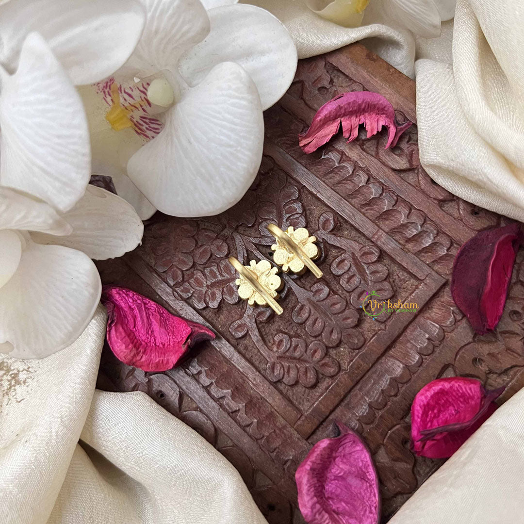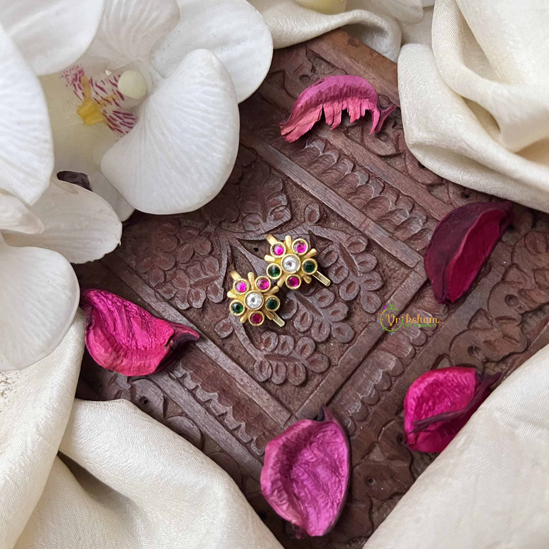 Embrace understated refinement with this minimalist bugadi, where simplicity meets artisanal brilliance. This elegant piece features a graceful round silhouette adorned with delicate floral kundan jadau work, embellished with carefully curated red, green, and white gemstones. The restrained design philosophy allows each stone to shine individually, creating a sophisticated interplay of color and light. Gold-plated for lasting lustre, the press mechanism provides effortless comfort and security. Ideal for weddings, celebrations, and everyday formal wear, this bugadi appeals to the discerning wearer who values quality craftsmanship over ornate excess. A versatile treasure that complements both traditional and contemporary styling with quiet elegance.