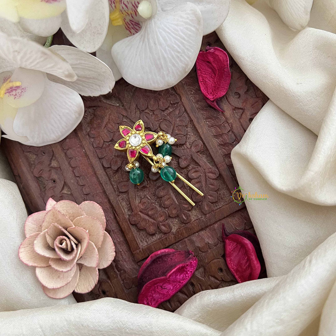 The Vriksham Minimality Floral Style Kundan Jadau Jada Billai features a delicate floral design adorned with white and green stones, complemented by a green bead and pearls. This elegant accessory offers a refined, understated charm, perfect for enhancing traditional hairstyles with subtle sophistication on special occasions.