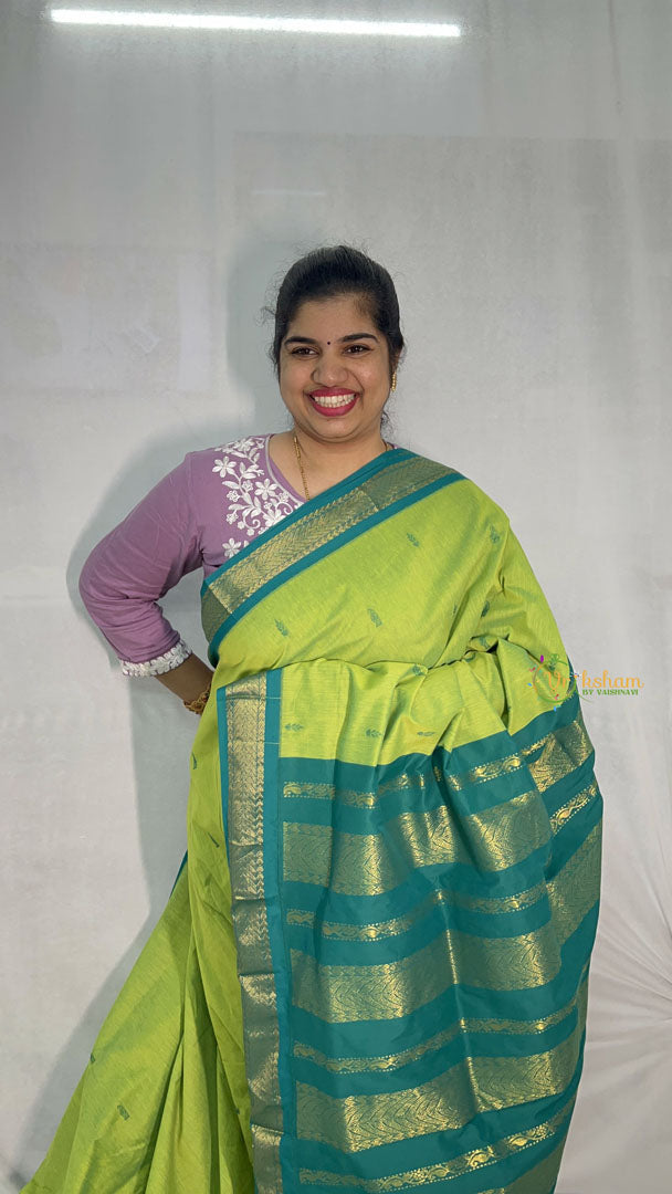 Discover serene sophistication with this refined Kalyani cotton saree, blending a delicate mint green palette with a deeper pine green border and ornate butta detailing. Woven from premium Kalyani cotton, the fabric offers exceptional breathability and comfort, perfect for all-day elegance and warm weather wear. The harmonious gradient of soft to forest green creates a calming yet refined aesthetic, ideal for formal occasions, celebrations, and elevated everyday settings. The traditional butta design showcases meticulous craftsmanship and celebrates authentic Indian textile artistry. Natural Kalyani cotton guarantees superior drape, durability, and effortless care. This elegant investment piece appeals to the discerning wearer who appreciates understated luxury, cultural heritage, and contemporary sensibilities—a versatile addition to any wardrobe that effortlessly elevates occasions with quiet confidence and enduring grace.