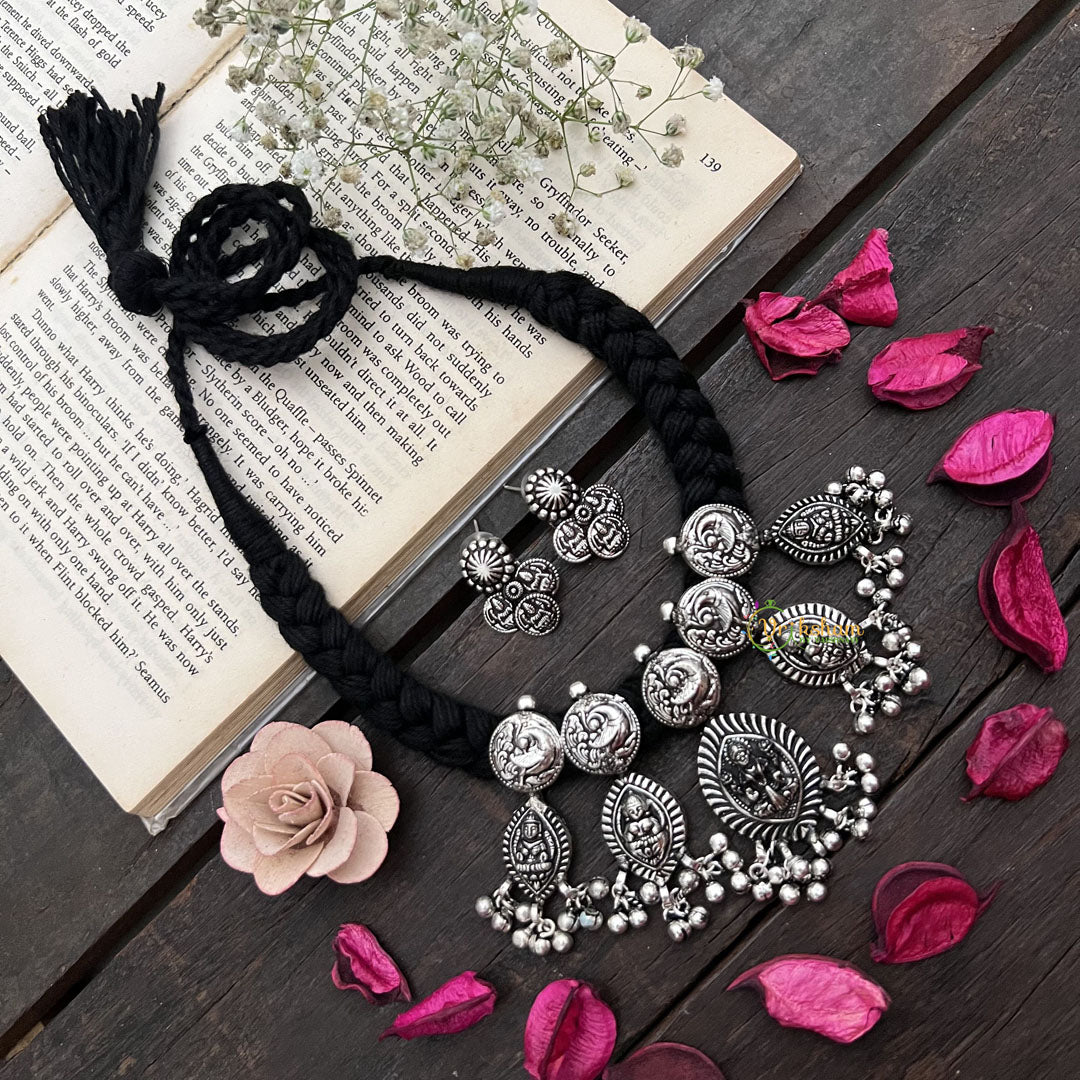 The Vriksham Mixed Motif Lakshmi Temple Pendant Necklace in oxidized silver features a harmonious blend of intricate motifs centered around the revered Lakshmi temple design. Crafted with attention to detail, this elegant neckpiece combines traditional symbolism with refined artistry, offering a sophisticated accessory that enriches any ensemble with cultural depth and timeless grace.