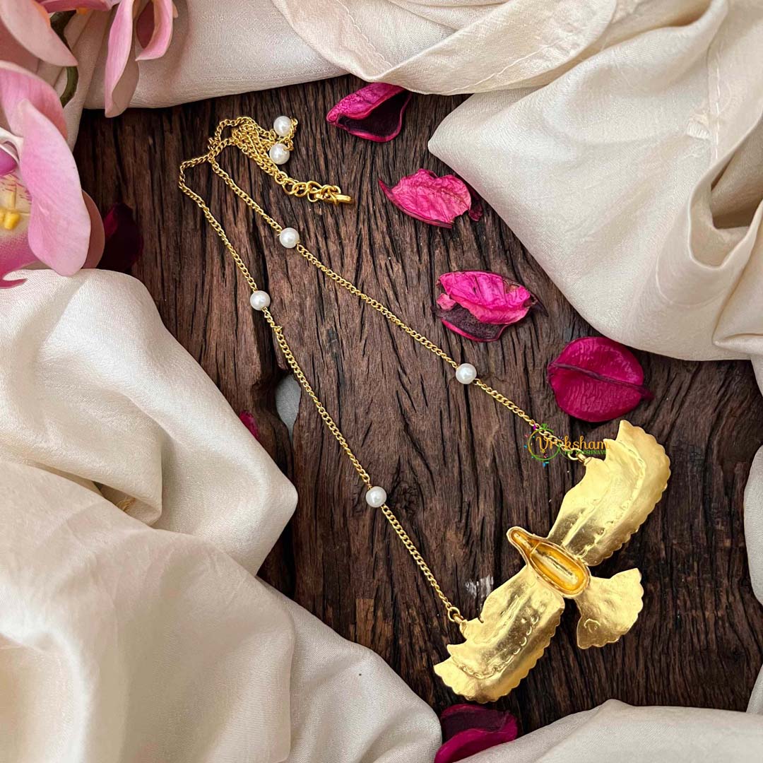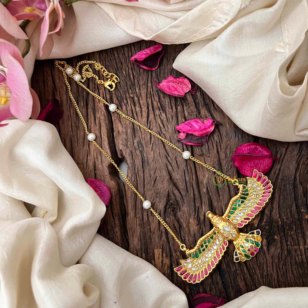 Discover the perfect fusion of heritage and contemporary style with this modern GandaBenda bird necklace, adorned with exquisite multi-color Kundan Jadau work. The delicate pearl chain elegantly frames the intricately embellished pendant, where precious gemstones catch light with every movement. This piece showcases traditional Indian craftsmanship elevated through a minimalist design approach, creating a versatile statement accessory. Perfect for those who cherish authentic artistry and seek jewelry that honors ancestral techniques while maintaining effortless modern appeal.