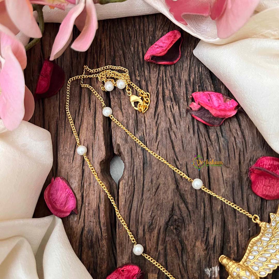 Experience contemporary elegance with this modern GandaBenda bird necklace, where minimalist design meets mythological inspiration. The delicate pearl chain gracefully suspends an artfully rendered bird pendant, creating a refined silhouette that complements any wardrobe. This piece bridges traditional symbolism with current aesthetic sensibilities, offering a subtle yet striking focal point for the neckline. Ideal for those who appreciate understated luxury and seek jewelry that speaks to both cultural heritage and modern sophistication.