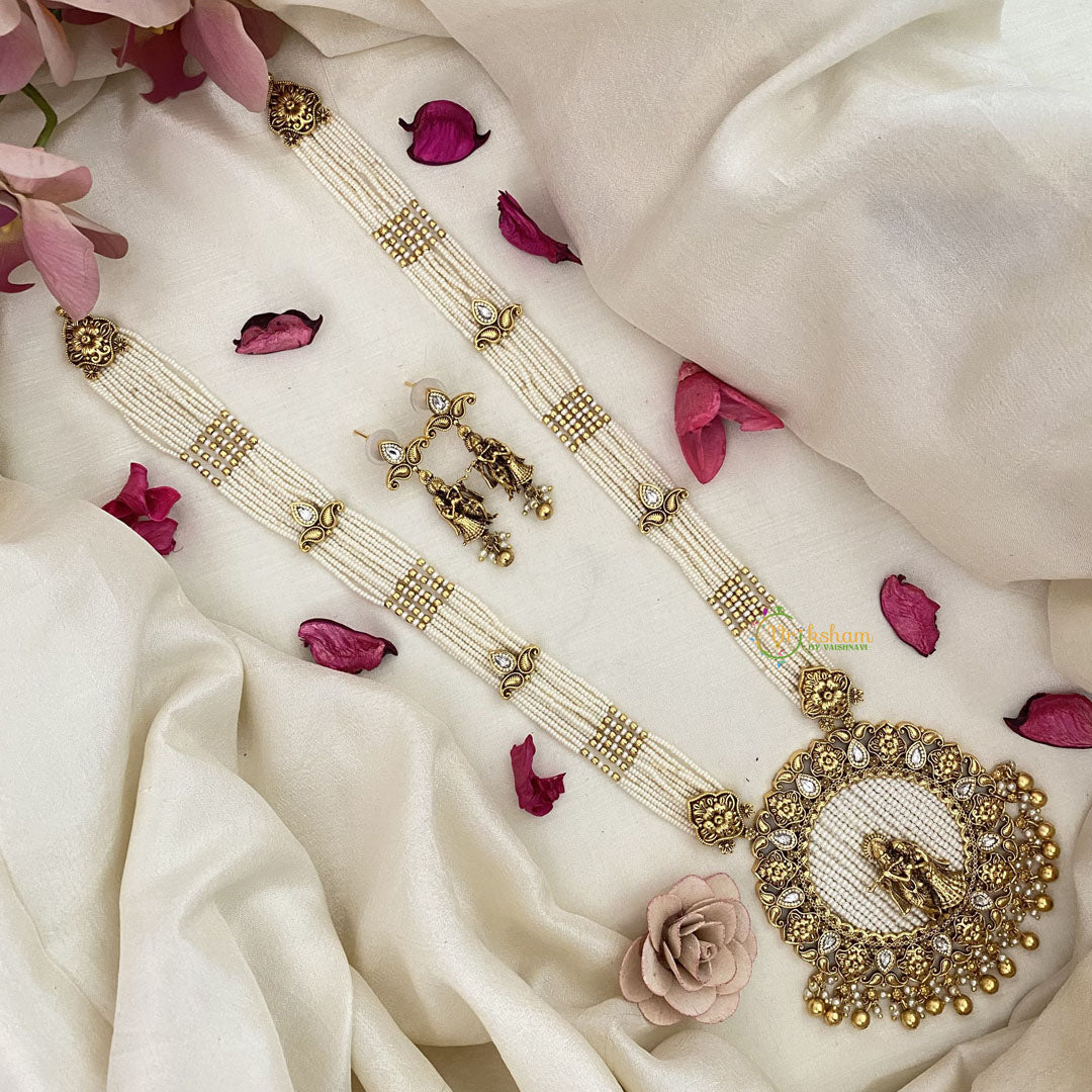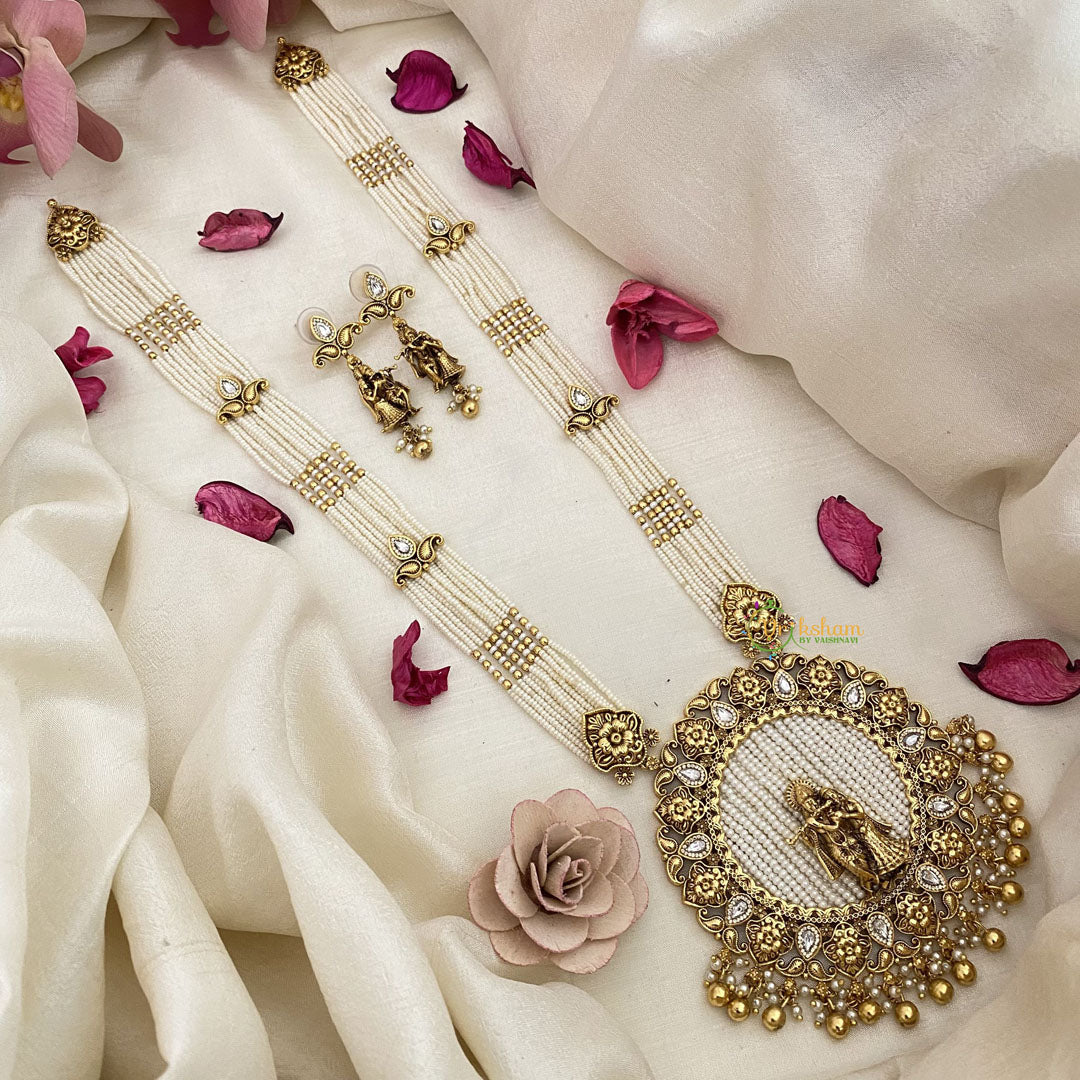 Embrace the divine elegance of Vriksham's Multilayered Radha Krishna Pendant Long Haram. Adorned with pearls and gold beads, this piece exudes sophistication and exclusivity. Let the delicate design and meticulous craftsmanship elevate your style to new heights. Perfect for any occasion, it's a must-have for those who appreciate the finer things in life.