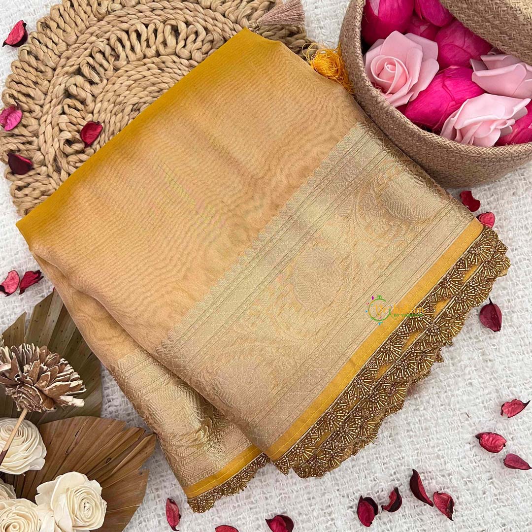 Radiate warmth and poise in this handloom organza saree rendered in a rich mustard hue that flatters and captivates. The luminous fabric drapes with effortless grace, offering a sophisticated alternative to conventional neutrals while maintaining timeless appeal. Meticulously woven using traditional handloom techniques, this saree embodies the finest qualities of artisanal craftsmanship and heritage weaving. The organza's delicate sheen catches light beautifully, creating an ethereal quality that commands presence without ostentation. Perfect for those who embrace bold yet refined color choices and value the authenticity of handcrafted textiles that transcend fleeting fashion cycles.