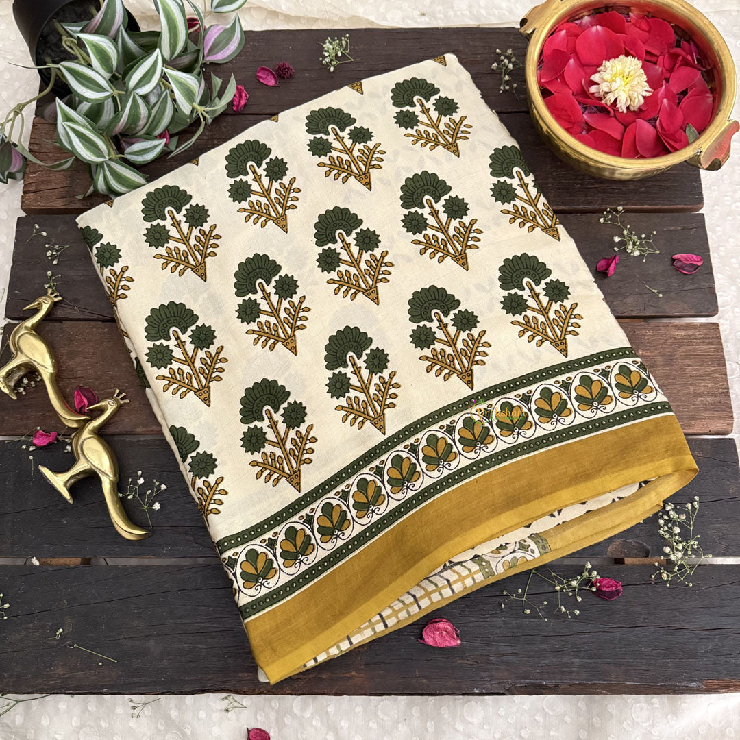 The Vriksham Naaz Brige Green Mustard Hand Block Printed Ajrakh Modal Silk Saree showcases a sophisticated blend of bridge green and mustard hues, enhanced by intricate hand block Ajrakh prints. Crafted from smooth modal silk, it offers a graceful drape and comfortable wear, making it an elegant choice for refined occasions that celebrate traditional artistry and timeless style.