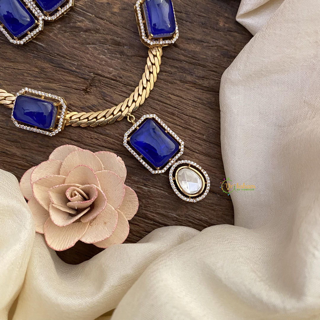 Indulge in the luxurious elegance of the Vriksham Natural Raw Stone Short Neckpiece. Featuring a stunning blue color and natural raw stones, this neckpiece is accented with a dazzling mossanite...