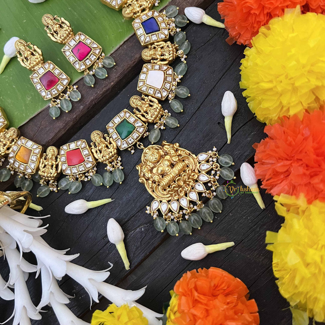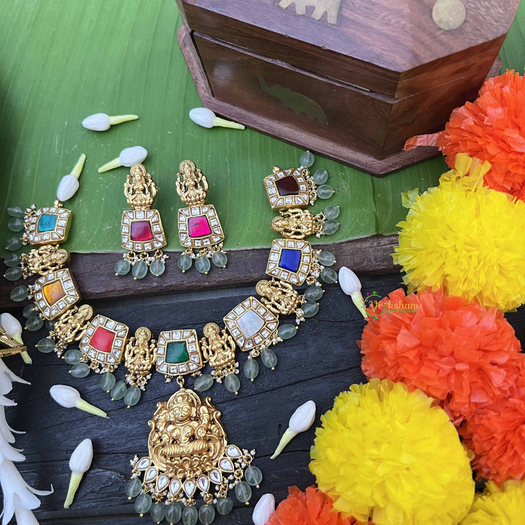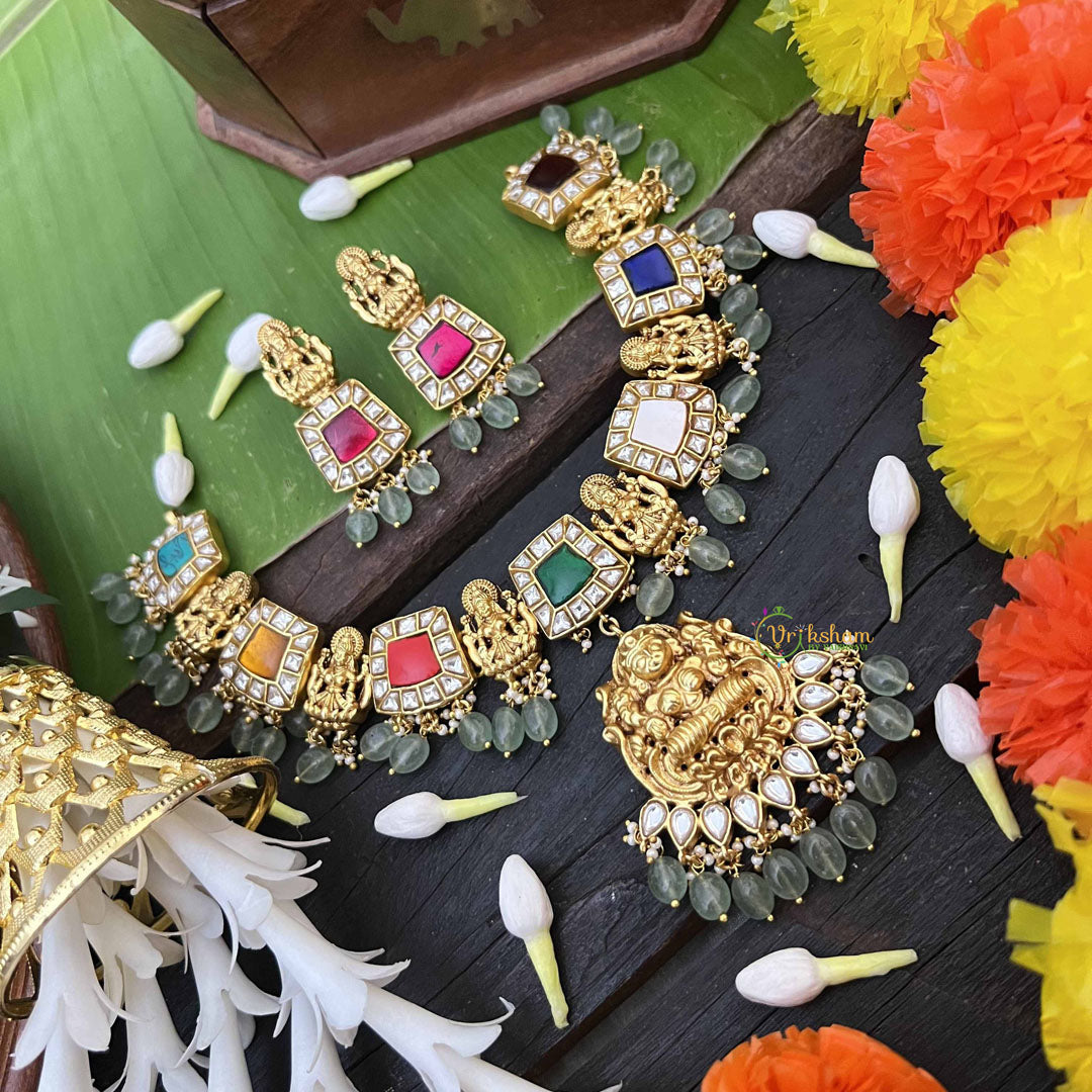 Radiate divine blessings with this exquisite Navaratna Temple Lakshmi pendant neckpiece, a harmonious blend of spiritual symbolism and refined craftsmanship. The nine sacred gemstones of the Navaratna arrangement surround an elegant Lakshmi pendant, each stone believed to channel distinct planetary energies and prosperity. Strung on luminous aqua green beads, this short neckpiece creates a striking visual contrast that enhances both traditional and contemporary attire. Perfect for temple ceremonies, auspicious occasions, and daily spiritual practice, this piece embodies the essence of classical Indian jewelry artistry. Wear it as a meaningful expression of faith and an invitation for abundance into your life.