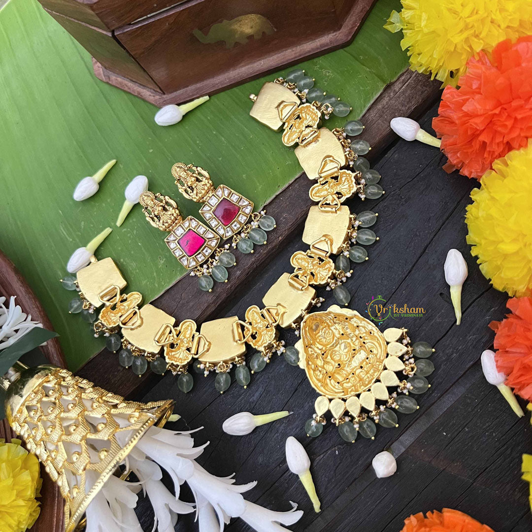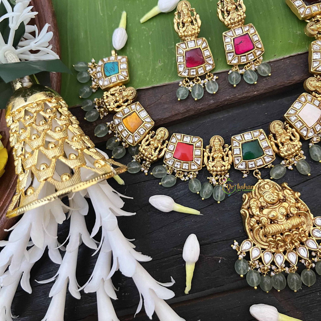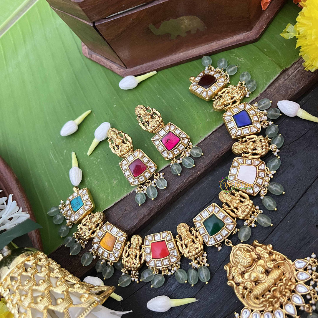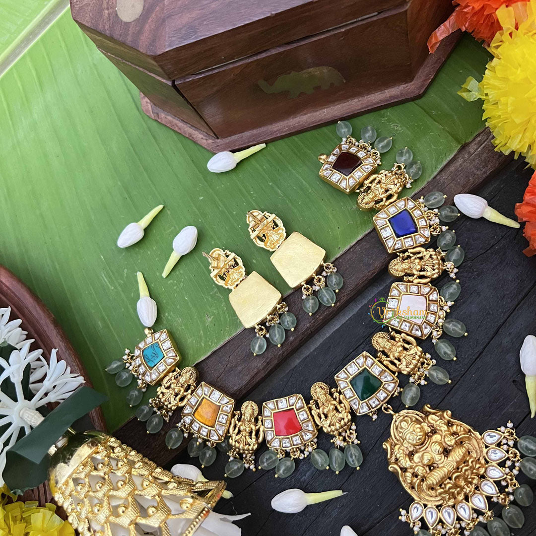 Radiate divine blessings with this exquisite Navaratna Temple Lakshmi pendant neckpiece, a harmonious blend of spiritual symbolism and refined craftsmanship. The nine sacred gemstones of the Navaratna arrangement surround an elegant Lakshmi pendant, each stone believed to channel distinct planetary energies and prosperity. Strung on luminous aqua green beads, this short neckpiece creates a striking visual contrast that enhances both traditional and contemporary attire. Perfect for temple ceremonies, auspicious occasions, and daily spiritual practice, this piece embodies the essence of classical Indian jewelry artistry. Wear it as a meaningful expression of faith and an invitation for abundance into your life.