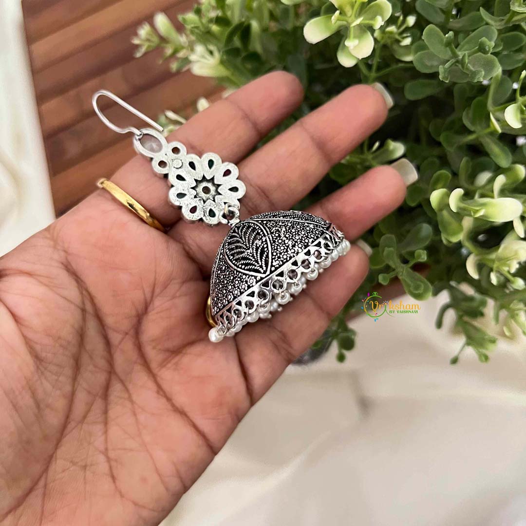 Experience celestial elegance with these enchanting jhumka earrings, inspired by Navratna traditions and featuring exquisite floral dangles adorned with luminous pearl fringes. The nine-gemstone aesthetic celebrates auspicious symbolism and spiritual significance, while the delicate floral motifs showcase botanical artistry and meticulous craftsmanship. Cascading pearl fringes introduce ethereal movement and refined grace, creating a mesmerizing visual effect. The harmonious composition of symbolic gemstones, organic floral forms, and soft pearl luminescence creates sophisticated visual richness and dimensional depth. Perfect for auspicious occasions, festive celebrations, or meaningful everyday wear, these earrings embody the intersection of spiritual tradition, artistic excellence, and timeless beauty. An ideal choice for those who honor cultural heritage and appreciate jewelry imbued with deeper meaning.